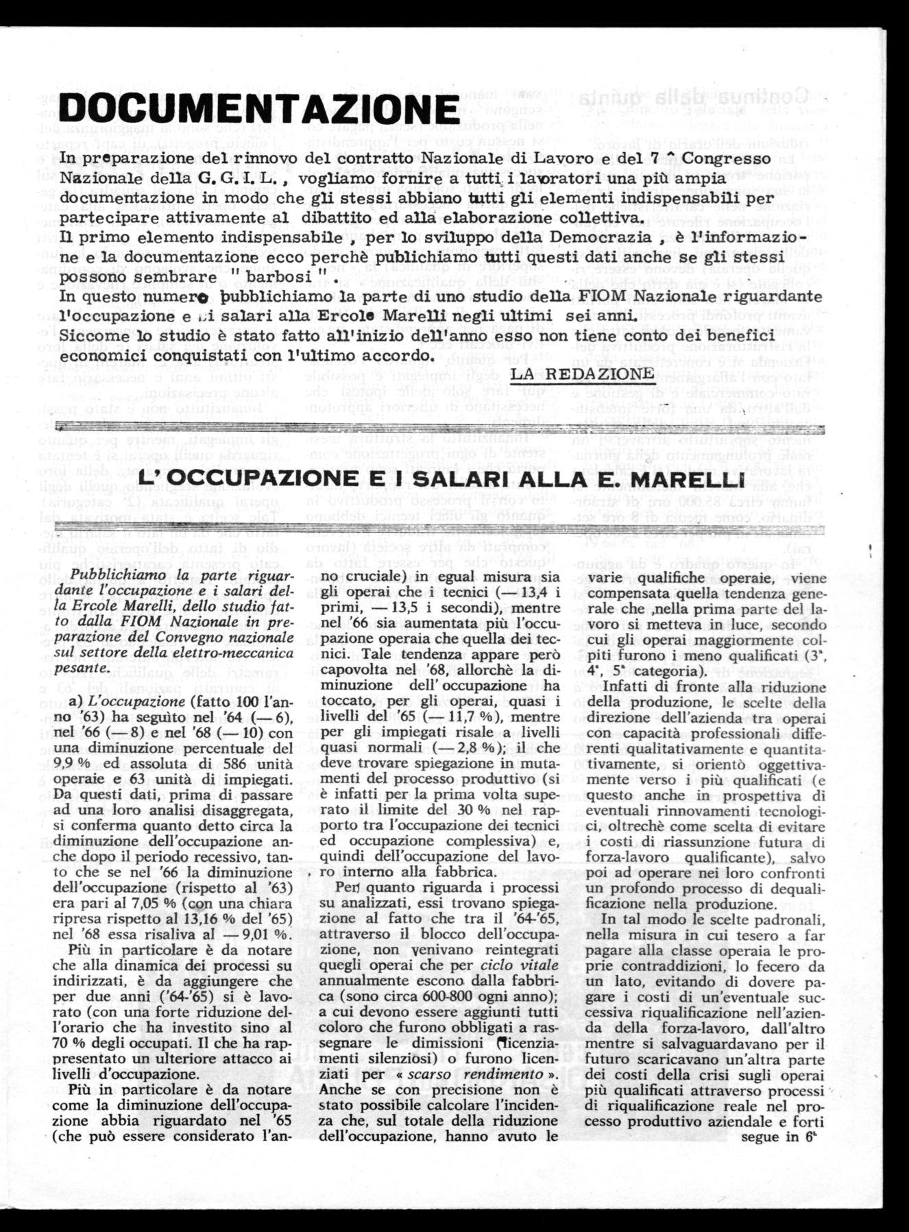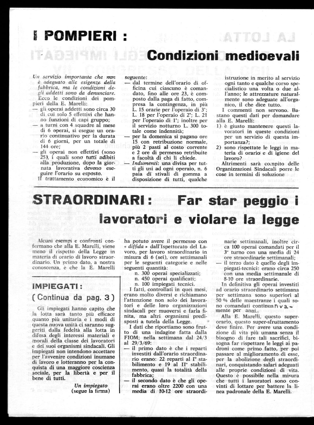 In altre parole, gli impiegati chiedono anche che le « relazioni umane » siano a base di una civile etica sociale cui si ispirano i dirigenti della E. Marelli che pare abbiano, ancora nel XX secolo, una mentalità schiavistica. Per queste cose gli impiegati entrano nella determinazione di fare più forte il sindacato, la C.I., il C.T.P., organismi indispensabili alle loro lotte per ottenere più tempo libero e maggiore reddito; per cancellare lo sconcio della « rotazione del lavoro » uno degli espedienti americani che il padrone italiano mette in atto per ridurre i costi di produzione e costringere gli impiegati a dare le dimissioni e cercare occupazione presso un altro datore di lavoro nella speranza di migliorare lo stipendio.