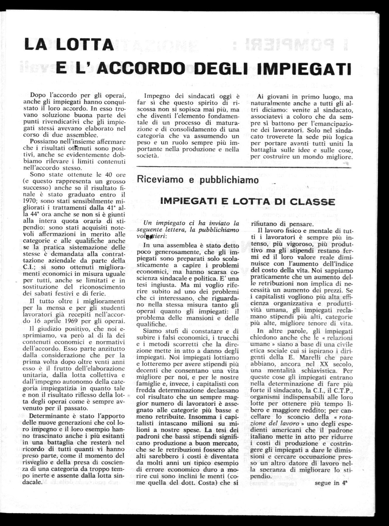 Dopo l'accordo per gli operai, anche gli impiegati hanno conquistato il loro accordo. In esso trovano soluzione buona parte dei punti rivendicativi che gli impiegati stessi avevano elaborato nel corso di due assemblee.