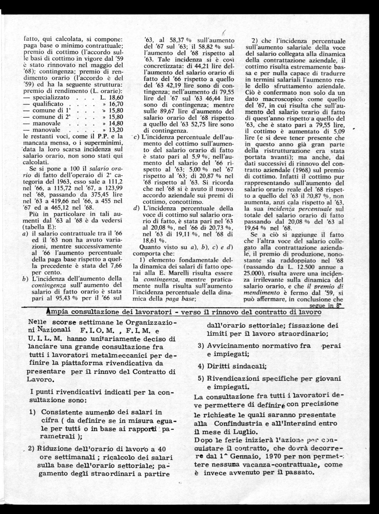 Se a ciò si aggiunge il fatto che l'altra voce del salario collegato alla contrattazione aziendale, il premio di produzione, nonostante sia raddoppiato nel '68 (passando da L. 12.500 annue a 25.000), risulta avere una incidenza irrilevante sulla dinamica del salario orario, e che il premio di mendimento è fermo dal '59, si può affermare, in conclusione che segue in 8' Ampia consultazione dei lavoratori - verso il rinnovo del contratto di lavoro