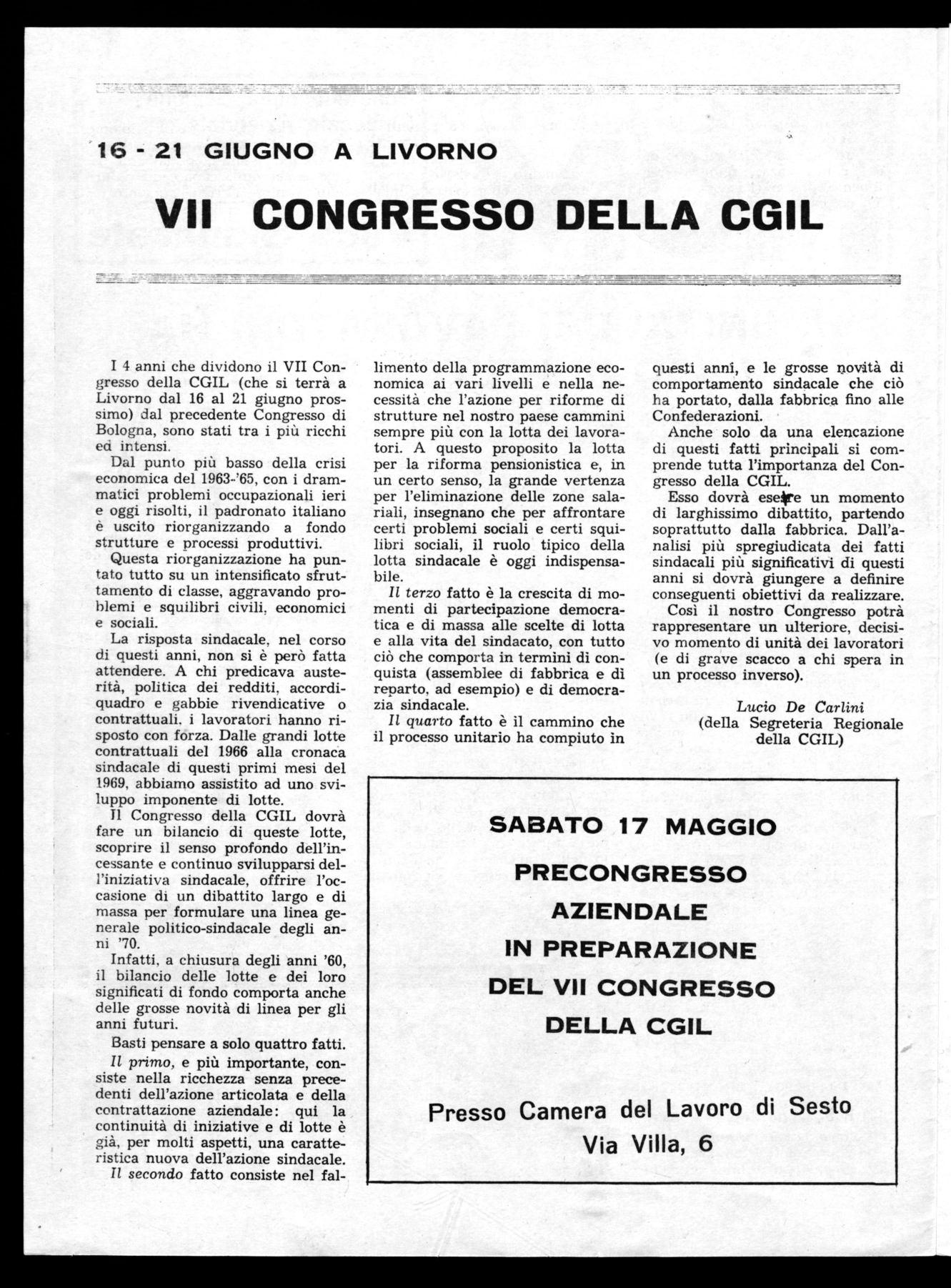 Esso dovrà esekre un momento di larghissimo dibattito, partendo soprattutto dalla fabbrica. Dall'analisi più spregiudicata dei fatti sindacali più significativi di questi anni si dovrà giungere a definire conseguenti obiettivi da realizzare.