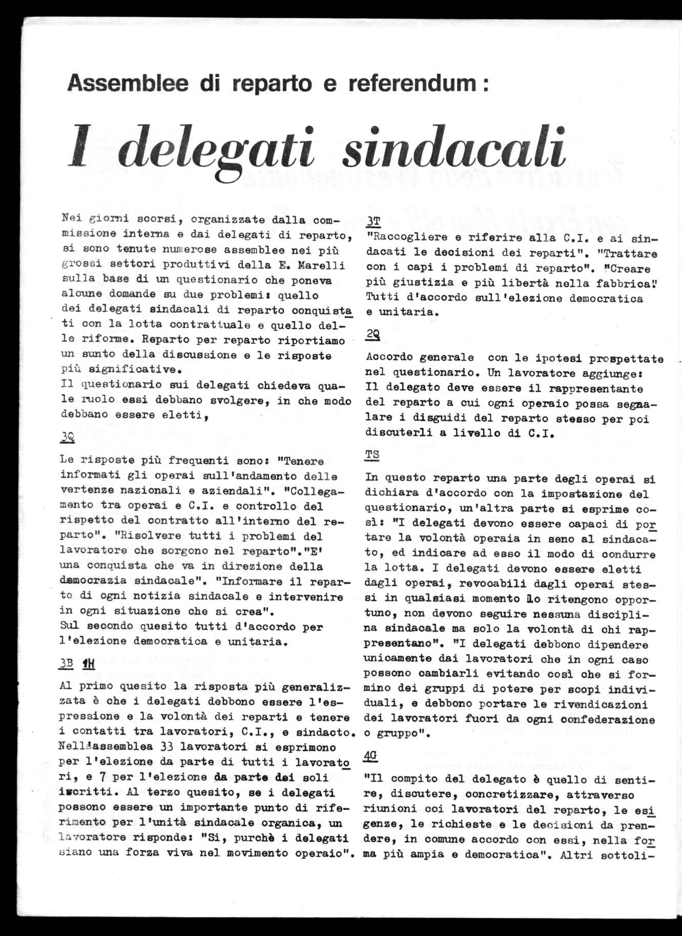 In questo reparto una parte degli operai si dichiara d'accordo con la impostazione del questionario, un'altra parte si esprime co— sì: "I delegati devono essere capaci di por tare la volontà operaia in seno al sindaca— to, ed indicare ad esso il modo di condurre la lotta. I delegati devono essere eletti dagli operai, revocabili dagli operai stes— si in qualsiasi momento lo ritengono oppor— tuno, non devono seguire nessuna discipli— na sindacale ma solo la volontà di ohi rap— presentano". "I delegati debbono dipendere unicamente dai lavoratori che in ogni caso possono cambiarli evitando così che si for— mino dei gruppi di potere per scopi indivi— duali, e debbono portare le rivendicazioni dei lavoratori fuori da ogni confederazione o gruppo".