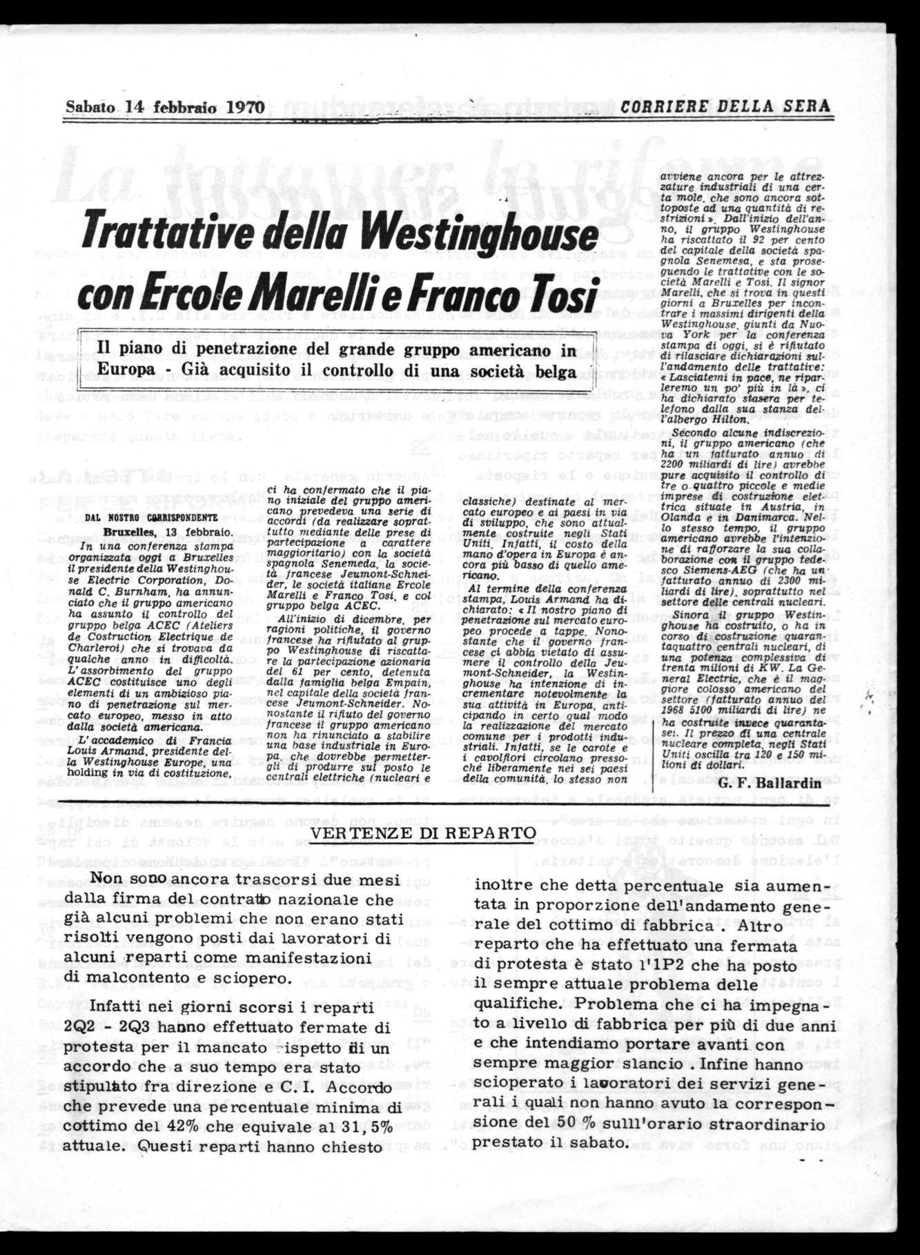 ci ha confermato che il piano iniziale del gruppo americano prevedeva una Serie di accordi (da realizzare soprattutto mediante delle prese di partecipazione a carattere maggioritario) con la società spagnola Senemeda, la società francese Jeumont-Schneider, le società italiane Ercole Marelli e Franco Tosi, e col gruppo belga ACEC.