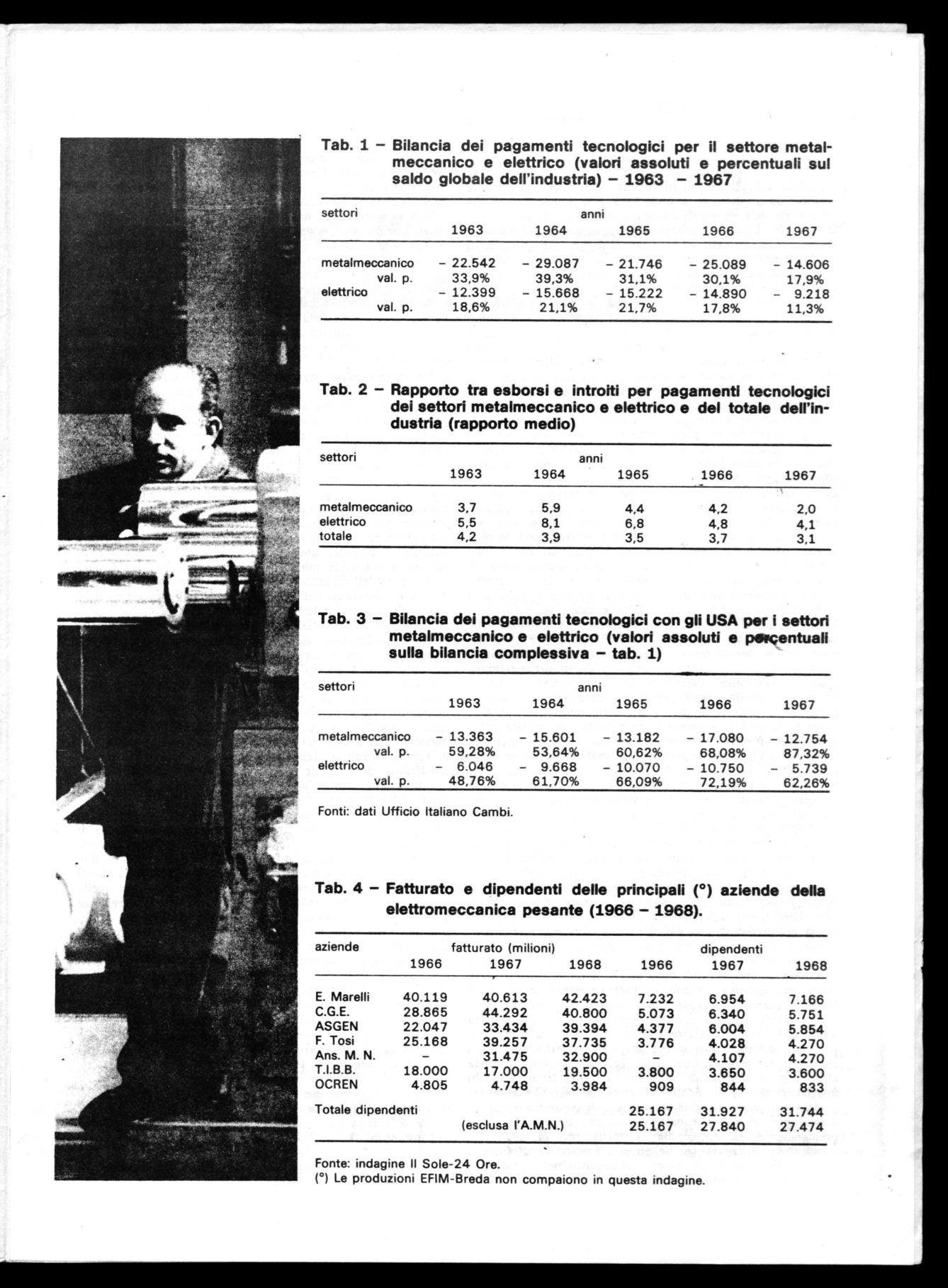 Tab. 1 - Bilancia dei pagamenti tecnologici per il settore metalmeccanico e elettrico (valori assoluti e percentuali sul saldo globale dell'industria) - 1963 - 1967