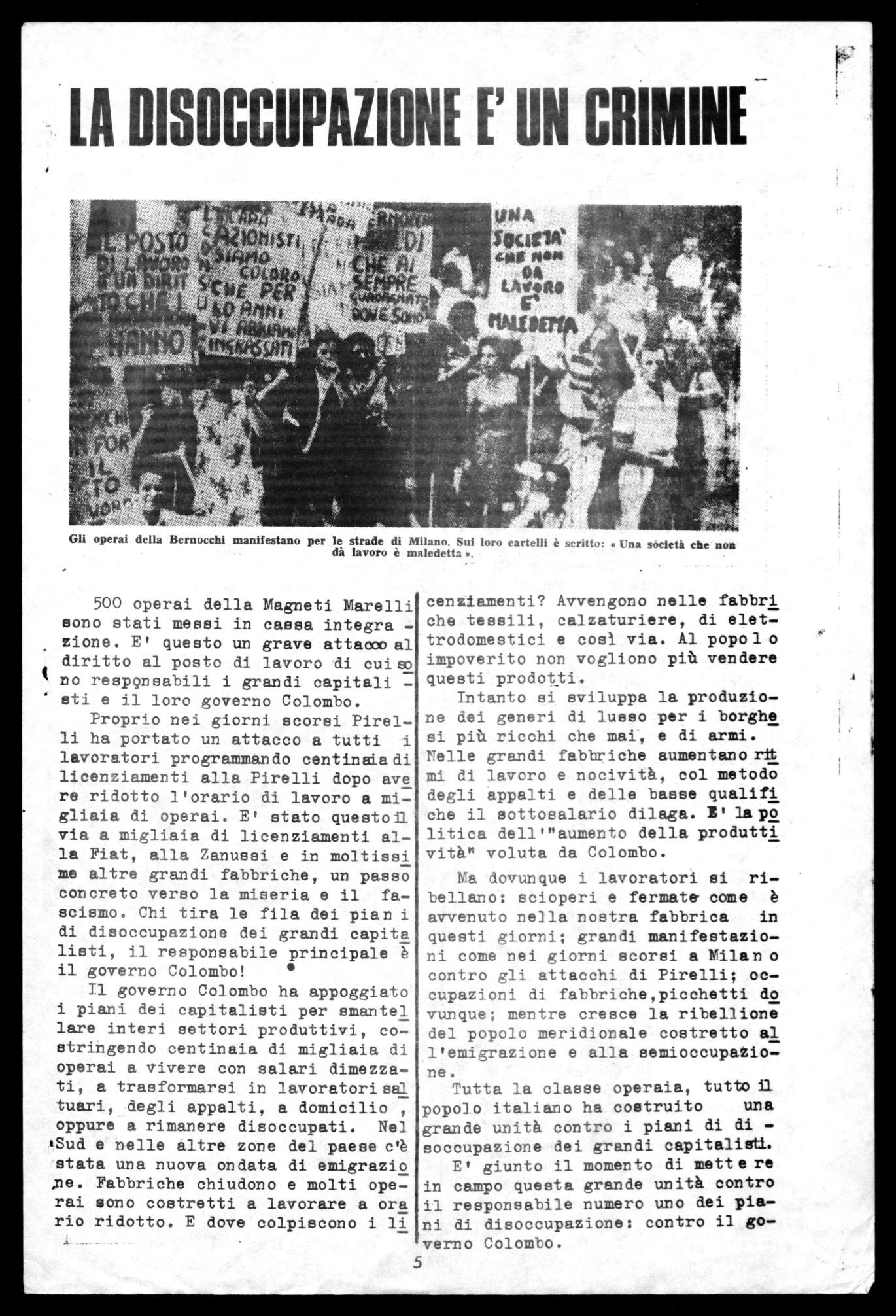 Gli operai della Bernocchi manifestano per le strade di Milano. Sui loro cartelli è scritto: « Una séeletà che non dà lavoro è maledetta ».Solo la classe operaia e il popo lo lavoratore possono avere a cuore che ci sia lavoro per tutti, mentre i grandi capitalisti e il loro governo costruiscono la loro ricchezza, il loro lusso proprio sulla disoccupazione crescente di migliai a e migliaia di lavoratori.