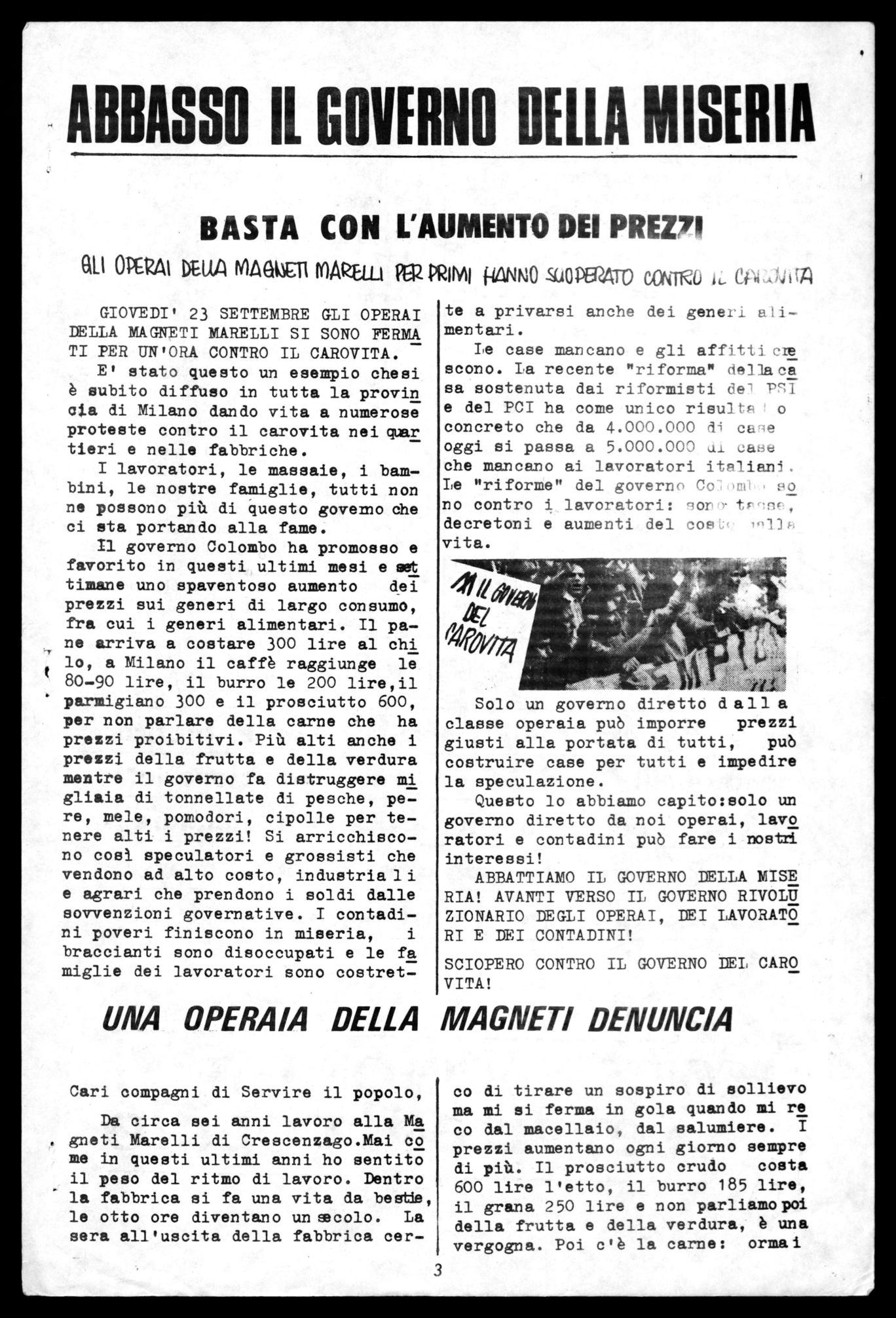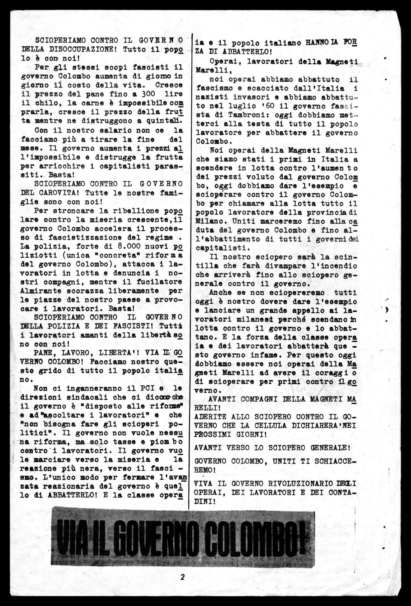 Noi operai della Magneti Marelli che siamo stati i primi in Italia a scendere in lotta contro l'aumen to dei prezzi voluto dal governo Colom bo, oggi dobbiamo dare l'esempio e scioperare contro il governo Colombo per chiamare alla lotta tutto il popolo lavoratore della provincia di Milano. Uniti marceremo fino allaca duta del governo Colombo e fino all'abbattimento di tutti i governidF,i capitalisti.