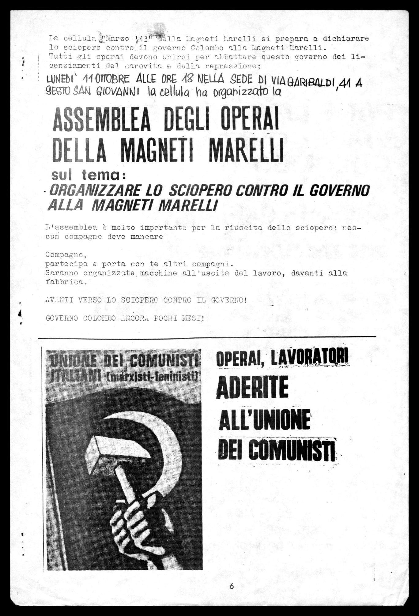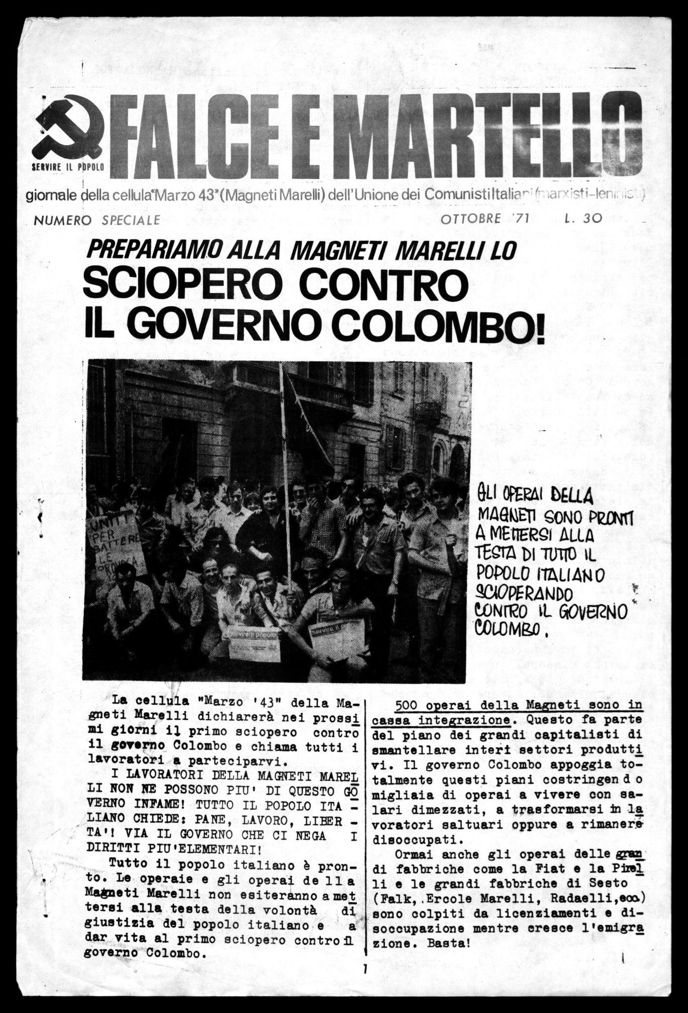 La cellula "Marzo '43" della Magneti Marelli dichiarerà nei prossi mi giorni il primo sciopero contro il governo Colombo e chiama tutti i lavoratori a parteciparvi.