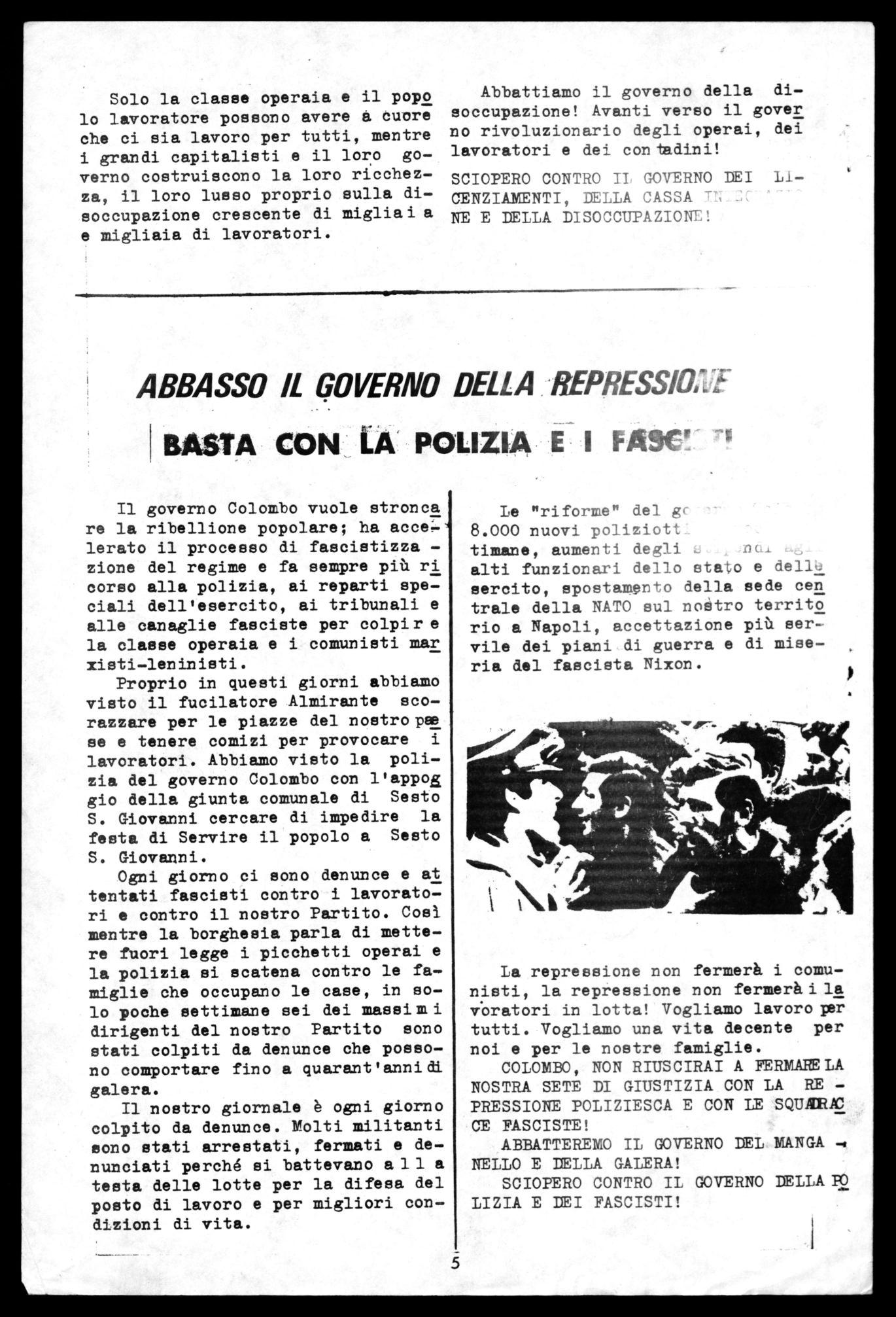 Per stroncare la ribellione popo lare contro la miseria crescente,il governo Colombo accelera il processo di fascistizzazione del regime . La polizia, forte di 8.000 nuovi po liziotti (unica "concreta" riforma del governo Colombo), attacca i lavoratori in lotta e denuncia i nostri compagni, mentre il fucilatone Almirante scorazza liberamente per le piazze del nostro paese a provocare i lavoratori. Basta!