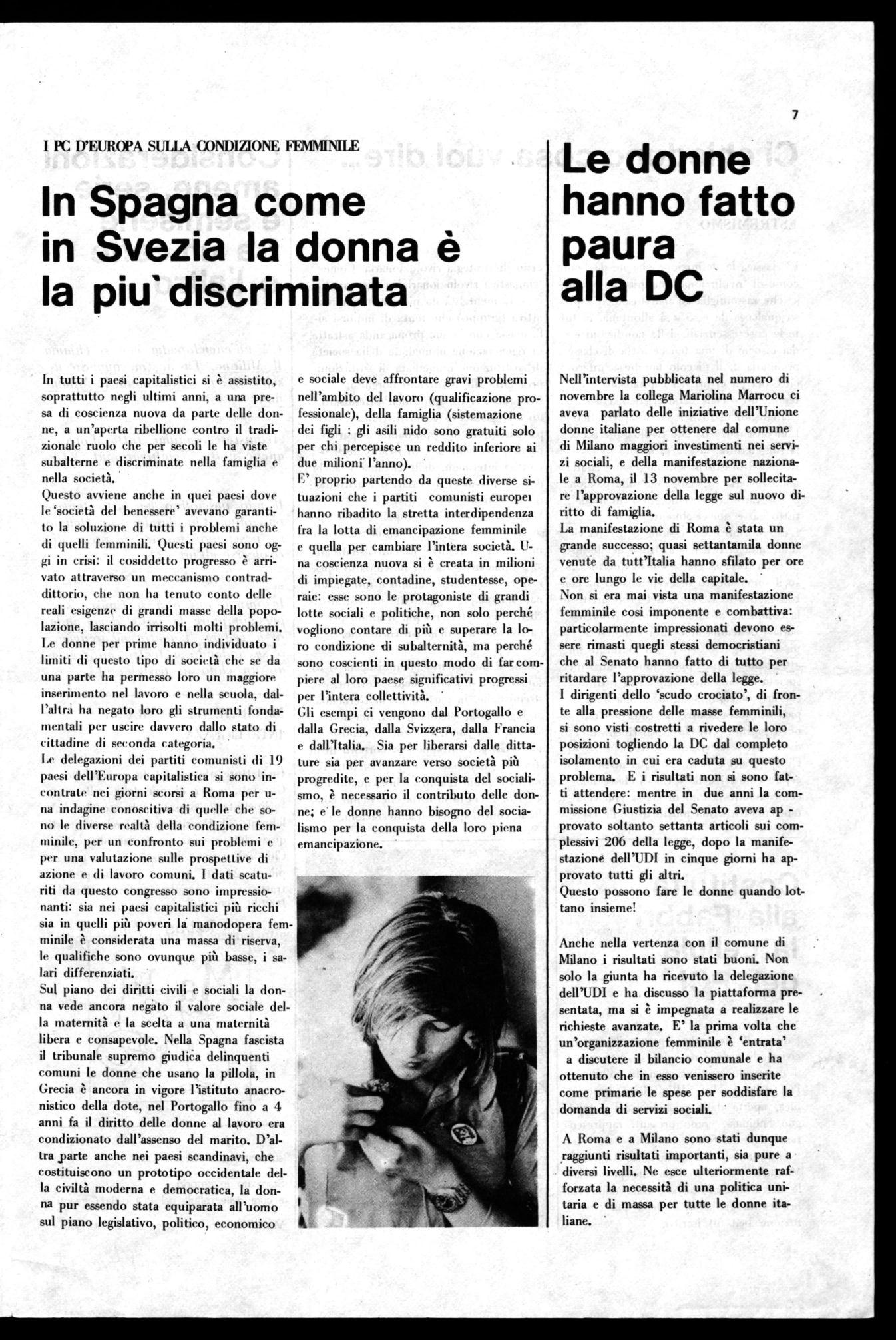 E' proprio partendo da queste diverse situazioni che i partiti comunisti europei hanno ribadito la stretta interdipendenza fra la lotta di emancipazione femminile quella per cambiare l'intera società. Una coscienza nuova si è creata in milioni di impiegate, contadine, studentesse, operaie: esse sono le protagoniste di grandi lotte sociali e politiche, non solo perché vogliono contare di più e superare la loro condizione di subalternità, ma perché sono coscienti in questo modo di far compiere al loro paese significativi progressi per l'intera collettività.