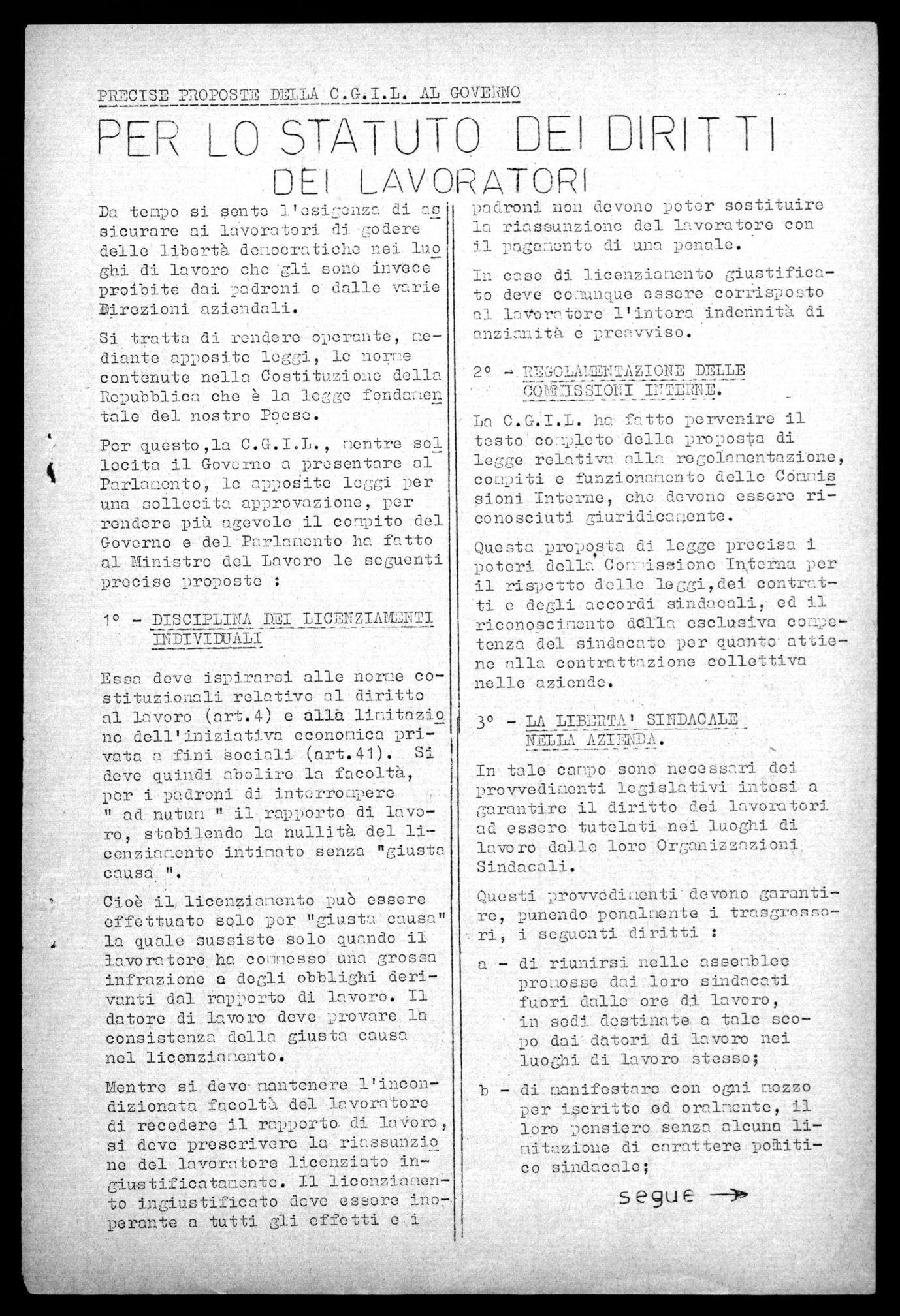 Per questo,la C.G.I.L., rientro sol lecita il Governo a presentare al Parlamento, lo appoSite leggi per una sollecita approvazione, per rendere più agevole il conpito del Governo e del Parlamento ha fatto al Ministro del Lavoro le seguenti precise proposte :