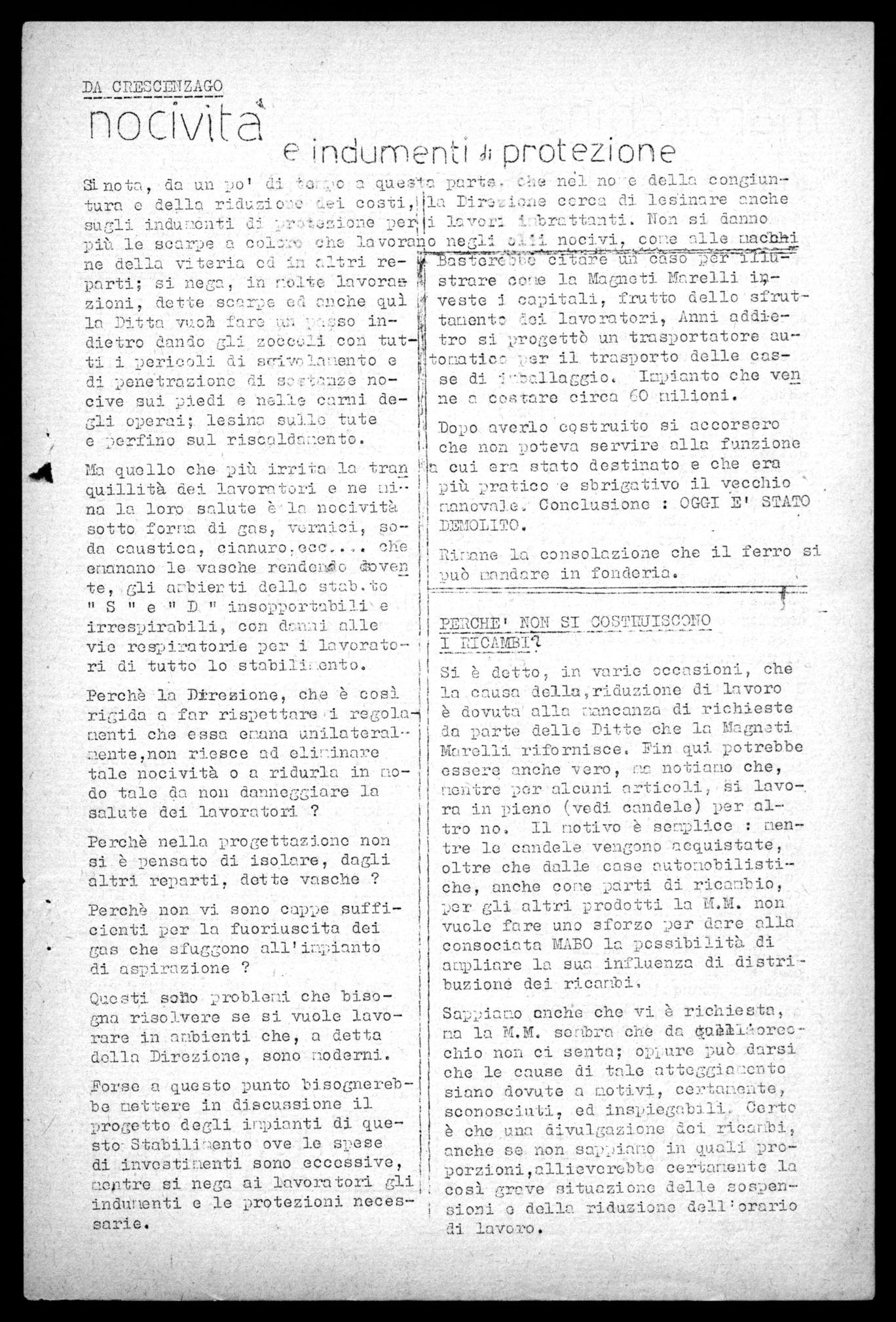 Si è detto, in varie occasioni, che ln.causa•della,riduzione di lavoro è dovuta alla mancanza di richieste da parte delle Ditte che la Magneti Mi -Areni rifornisce. Fin qui potrebbe essere anche vero, mn notiano che, nentre per alcuni orticoli, Si lavo-. ra in pieno (vedi candele) per altro no. Il notivo è semplice : mentre le candele vengono acquistate, oltre che dalle case nutonobilistiche, anche core parti di ricanbio, per gli altri prodotti la M.M. non vuole fare uno sforzo per dare alla consociata MABO la possibilità di anpliare la sua influenza di distribuzione dei ricambi,