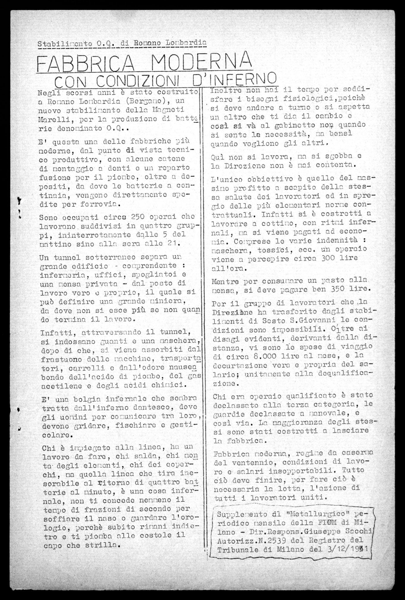 Fabbrica moderna, regine da caserna del ventennio, condizioni di lavoro e salari insopportabili. Tutto ciò deve finire, per fare ciò è necessaria la lotta, l'azione di tutti i lavoratori uniti.