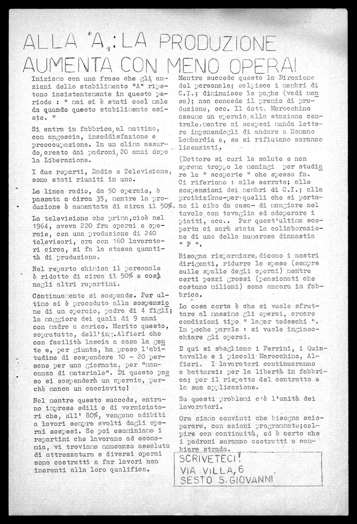 Iniziano questa corrispondenza dal la fabbrica con un riforionto alla Resistenza vissuta e sofferta pure-da nolti lavoratori della MaGneti Marelli, il cui contenuto fu ed è quella della libert; libertà non solo dalla dittatura, na sopratutto l bértà nel proGree sociale costruito giorno per GioT.ao dalla feconda opera di ciascun lavoratore nelle fabbriche, nei cantieri e nelle vario branche dell'attività unana. Questo il si,nificato essenziale della Resistenza i- cui vt lori morali e civili vanno. difesi e propagati per una società sempre più Giusta, sempre più. libera. Ma eccoci che entrando in arGemento rileviamo che in' pieno reGime repubblicano e plausibilnente democratico, la Direzione della Magneti Marelli abusa sistematicanente del suo potere -oer- svilire la per sonalità dei lavbràtori attuandogiorno per Giorno provvedimenti uni laterali d'estrema Gravità che non esitiamo a definire di marca fascista.