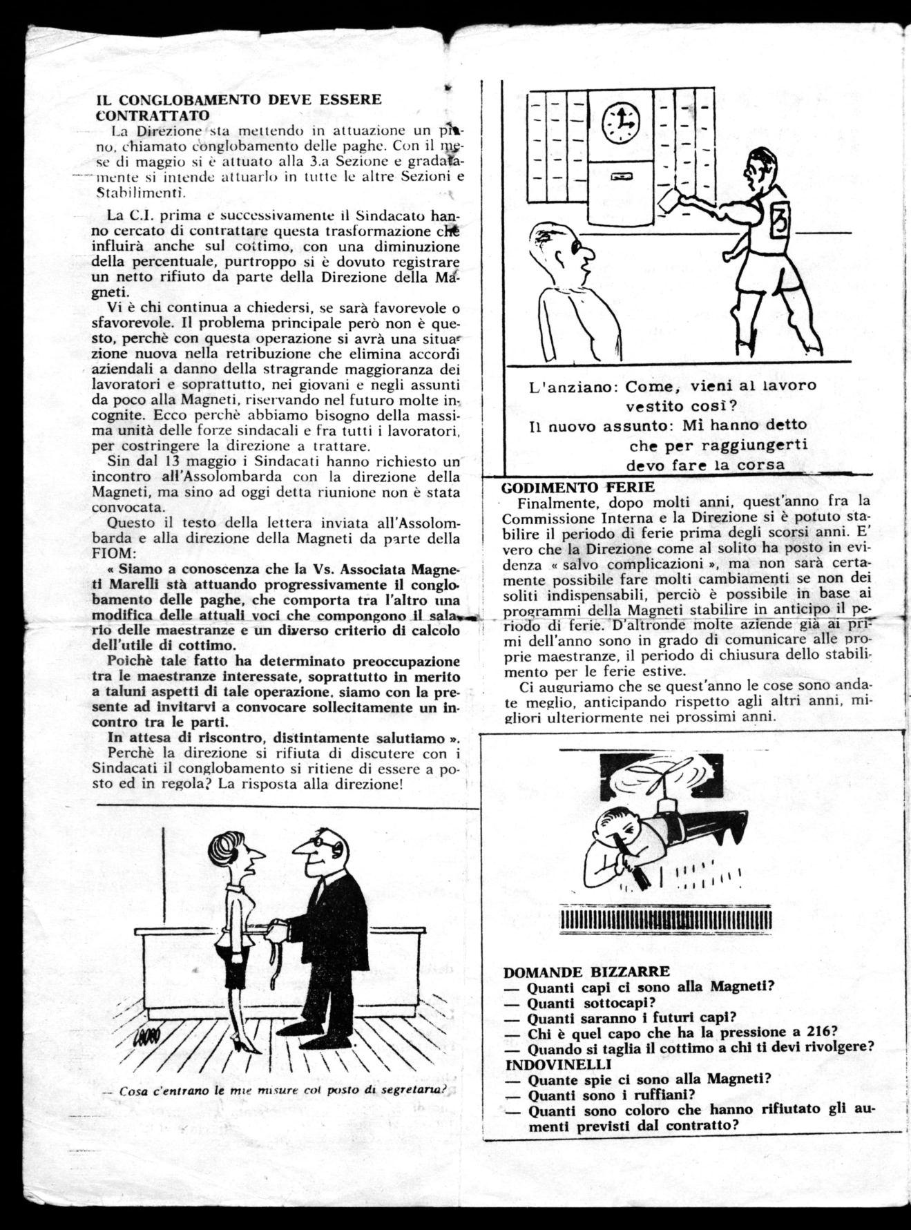 « Siamo a conoscenza che la Vs. Associata Magneti Marelli stà attuando progressivamente il conglobamento delle paghe, che comporta tra l'altro una modifica delle attuali voci che compongono il sala~. . rio delle maestranze e un diverso criterio di calcolo dell'utile di cottimo.