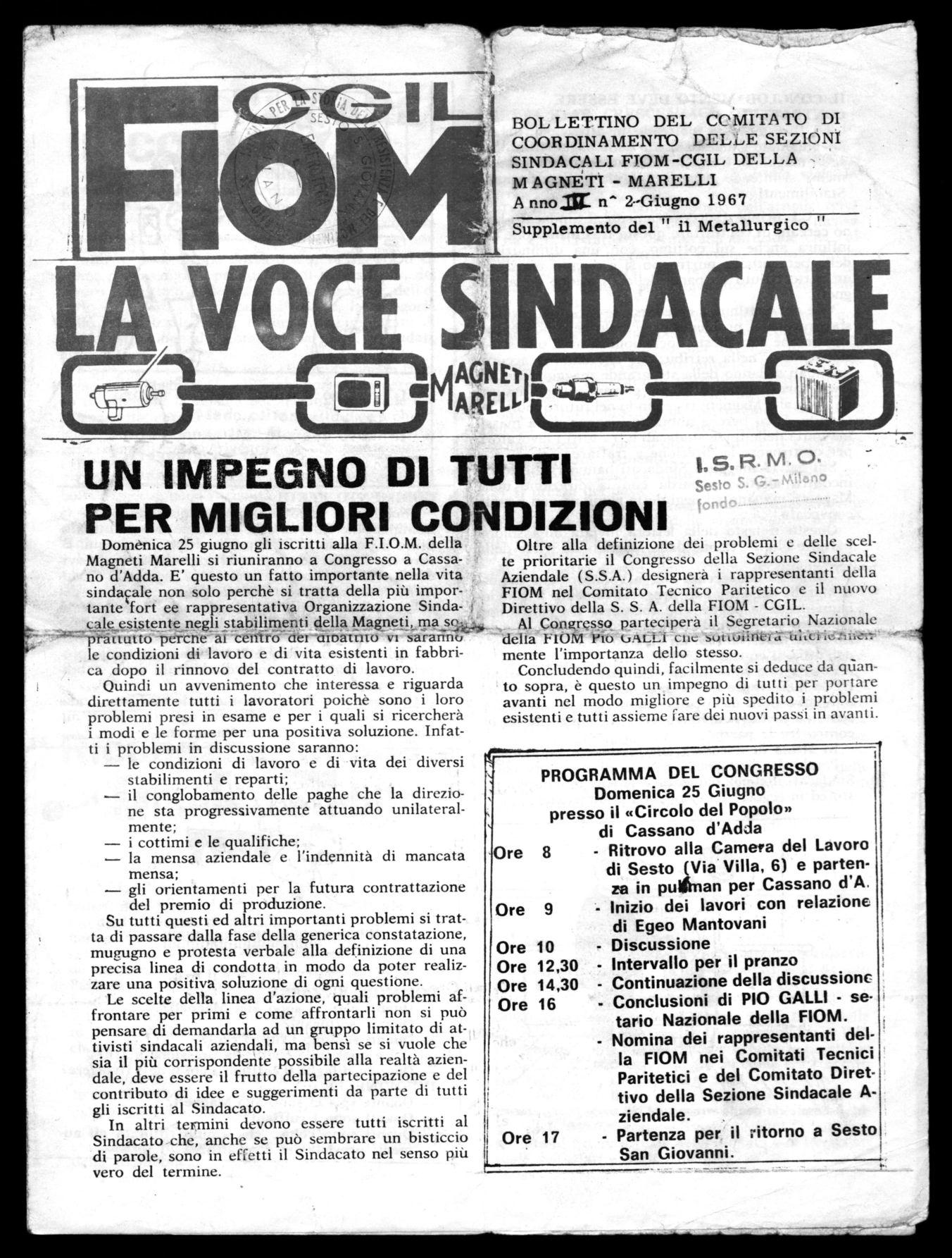 Domenica 25 giugno gli iscritti alla F.I.O.M. della Magneti Marelli si riuniranno a Congresso a Cassano d'Adda. E' questo un fatto importante nella vita sindacale non solo perchè si tratta della più importante fort ee rappresentativa Organizzazione Sinda_qAle,..esistente negli stabilimenti della Magneti, ma -pMítutto peroneeai centrò dei -Ornami° vi sararin17 — le condizioni di lavoro e di vita esistenti in fabbrica dopo il rinnovo del contratto di lavoro.