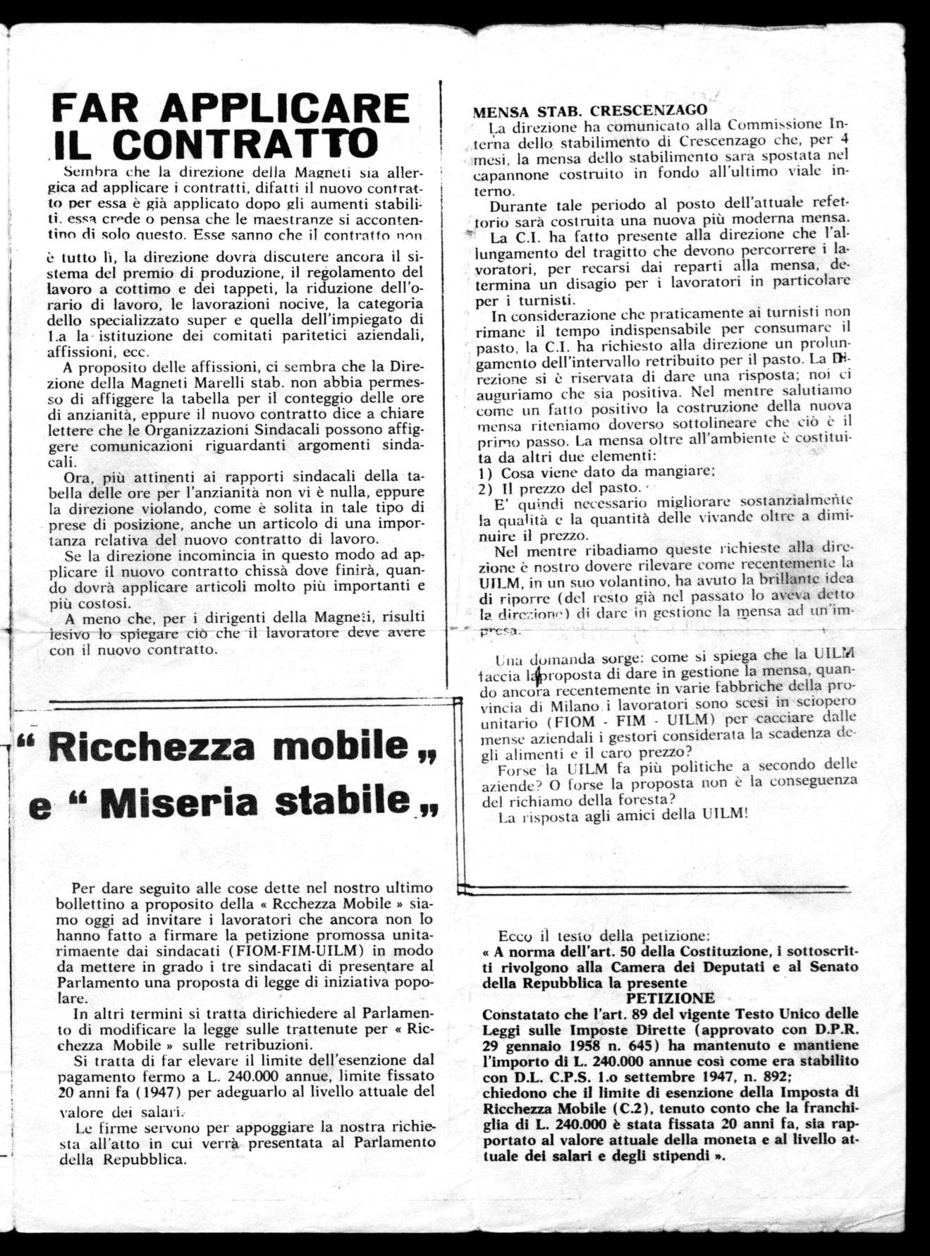 Per dare seguito alle cose dette nel nostro ultimo bollettino a proposito della « Rcchezza Mobile « siamo oggi ad invitare i lavoratori che ancora non Io hanno fatto a firmare la petizione promossa unitarimaente dai sindacati (FIOM-FIM-UILM) in modo da mettere in grado i tre sindacati di presentare al Parlamento una proposta di legge di iniziativa popolare.