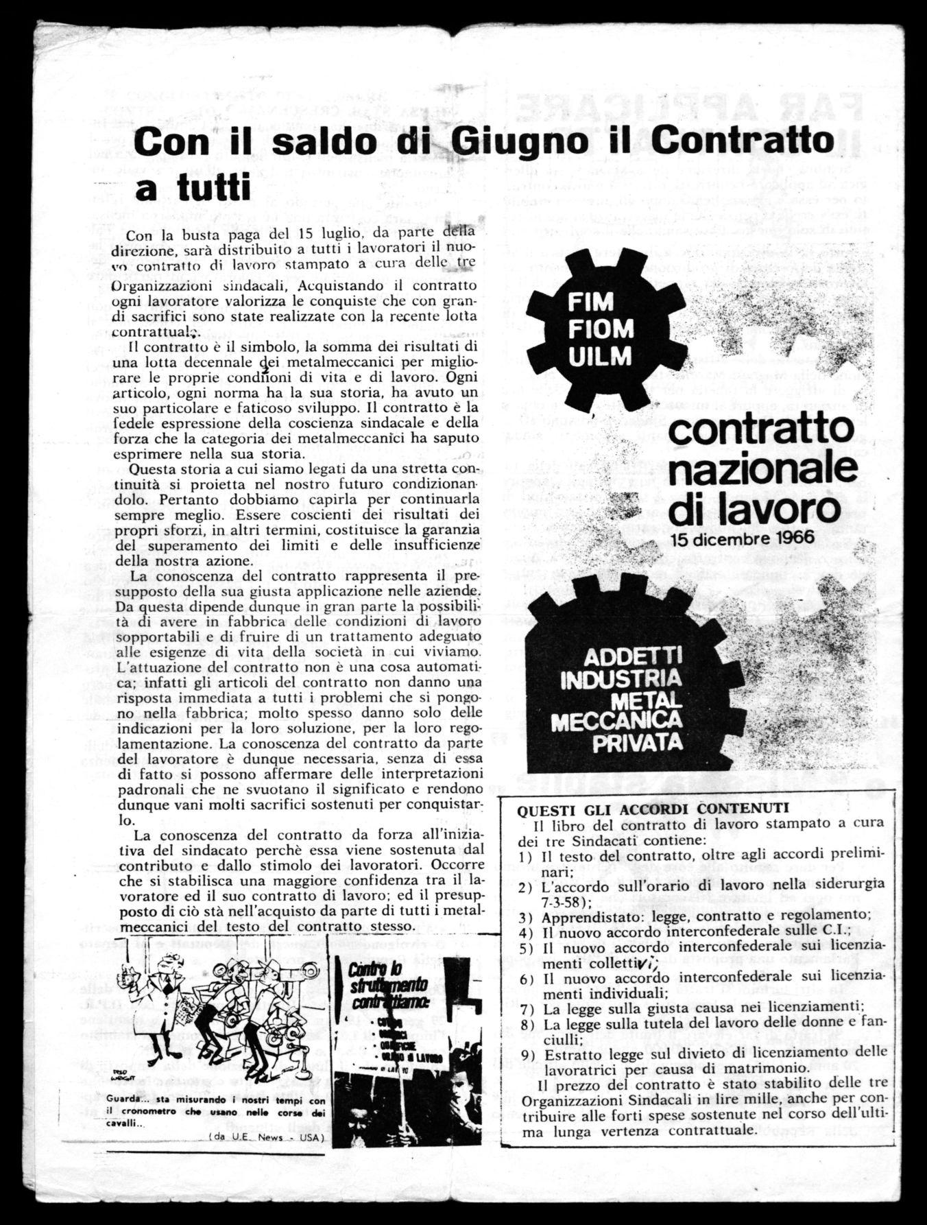 La conoscenza del contratto da forza all'iniziativa del sindacato perchè essa viene sostenuta dal contributo e dallo stimolo dei lavoratori. Occorre che si stabilisca una maggiore confidenza tra il lavoratore ed il suo contratto di lavoro; ed il presupposto di ciò stà nell'acquisto da parte di tutti i metalmeccanici del testo del contratto stesso.