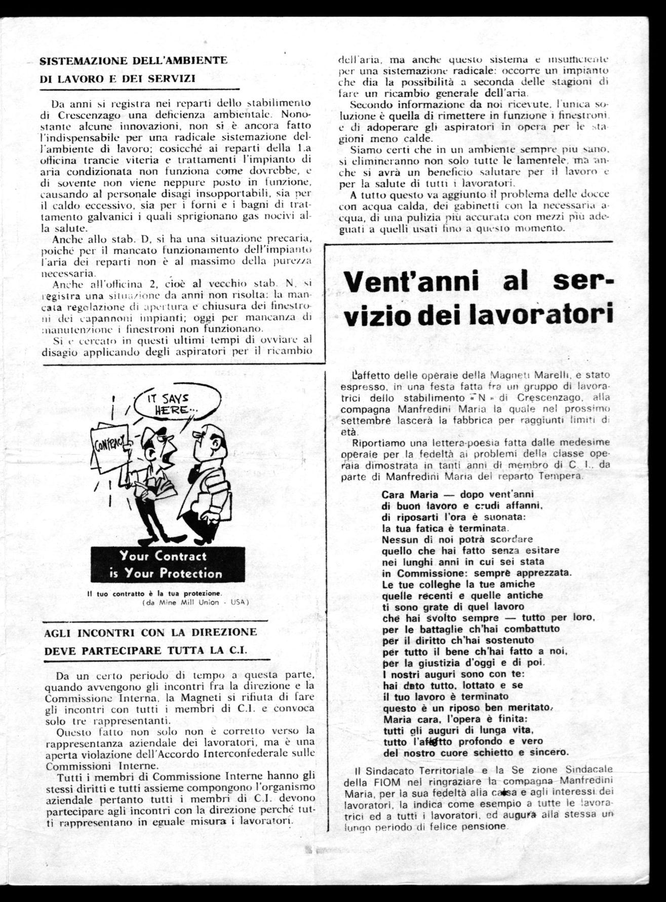 Si prevede che la Magneti nei prossimi anni avrà uno sviluppo enorme in particolare nel campo degli equipaggiamenti elettrici. Infatti la FIAT. che detiene ormai il comando sulla Magneti, pensa di ampliare gli stabilimenti con grandi investimenti ed una sempre crescente semiautomazione, questo non certo pèr dar lavoro a sempre più operai, ma riducendo sempre più — in proporzione il personale. Fin d'oggi si pone un problema che non è quello di fermare il processo di riammodernamento e di un progresso produttivo, ma soprattutto inserire in questo sviluppo la riduzione dell'orario di lavoro a parità di salario, per arrivare ad un sistema di lavoro che poggi non sul massimo redimento sulle braccia dei lavoratori, ma di un metodo che metta il lavoratore in condizioni di produrre di più diminuendo lo sforzo psicofisico delle lavoratrici e dei lavoratori arrivando a quelle,'forme che, coincidendo co nil progresso tecnico si arrivi ad un vero progresso sociale.