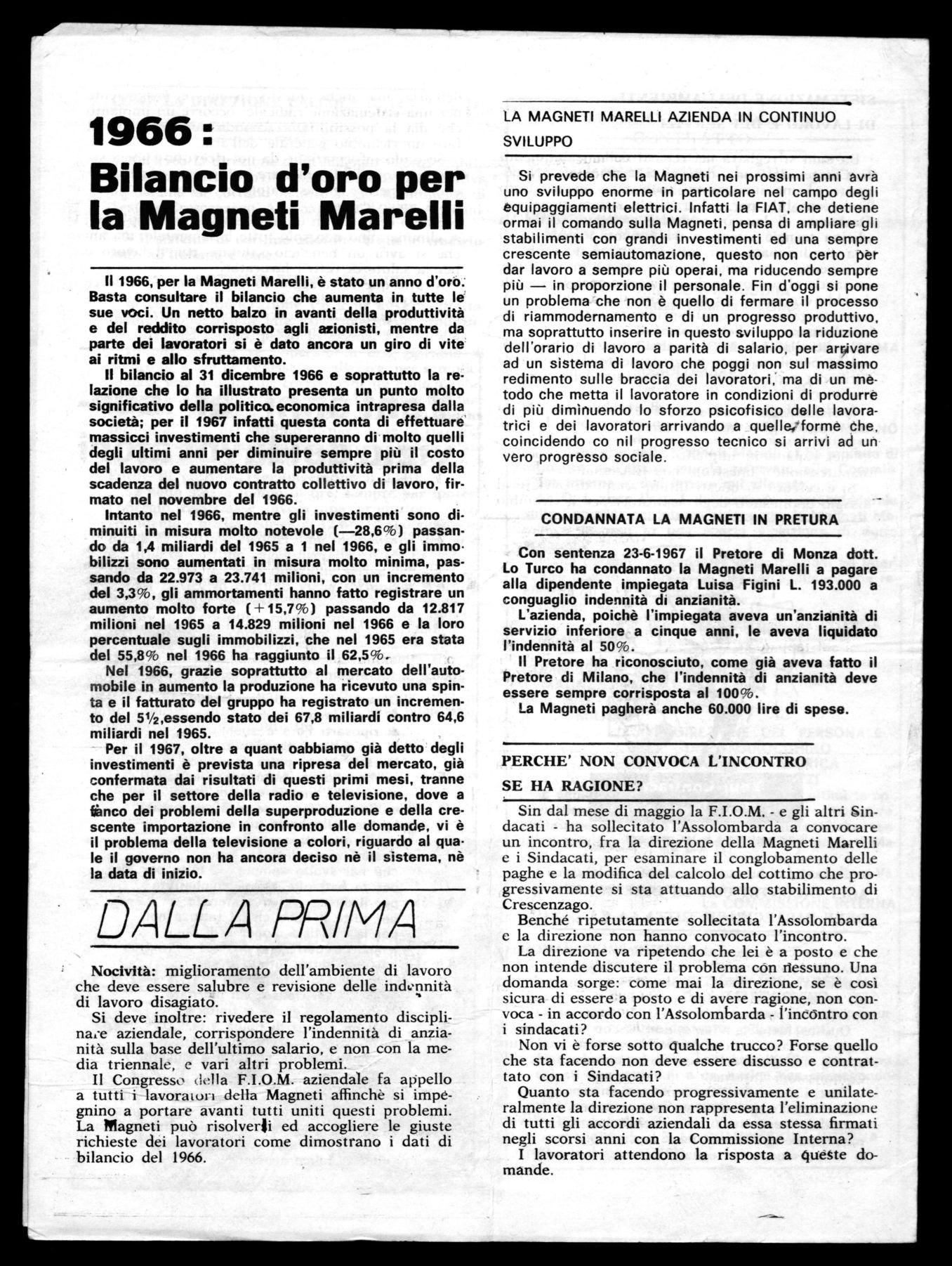 tuo contratto è la tua protezione.11 1966, per la Magneti Marelli, è stato un anno d'oro. Basta consultare il bilancio che aumenta in tutte le sue voci. Un netto balzo in avanti della produttività e del reddito corrisposto agli azionisti, mentre da parte dei lavoratori si è dato ancora un giro di vite ai ritmi e allo sfruttamento.