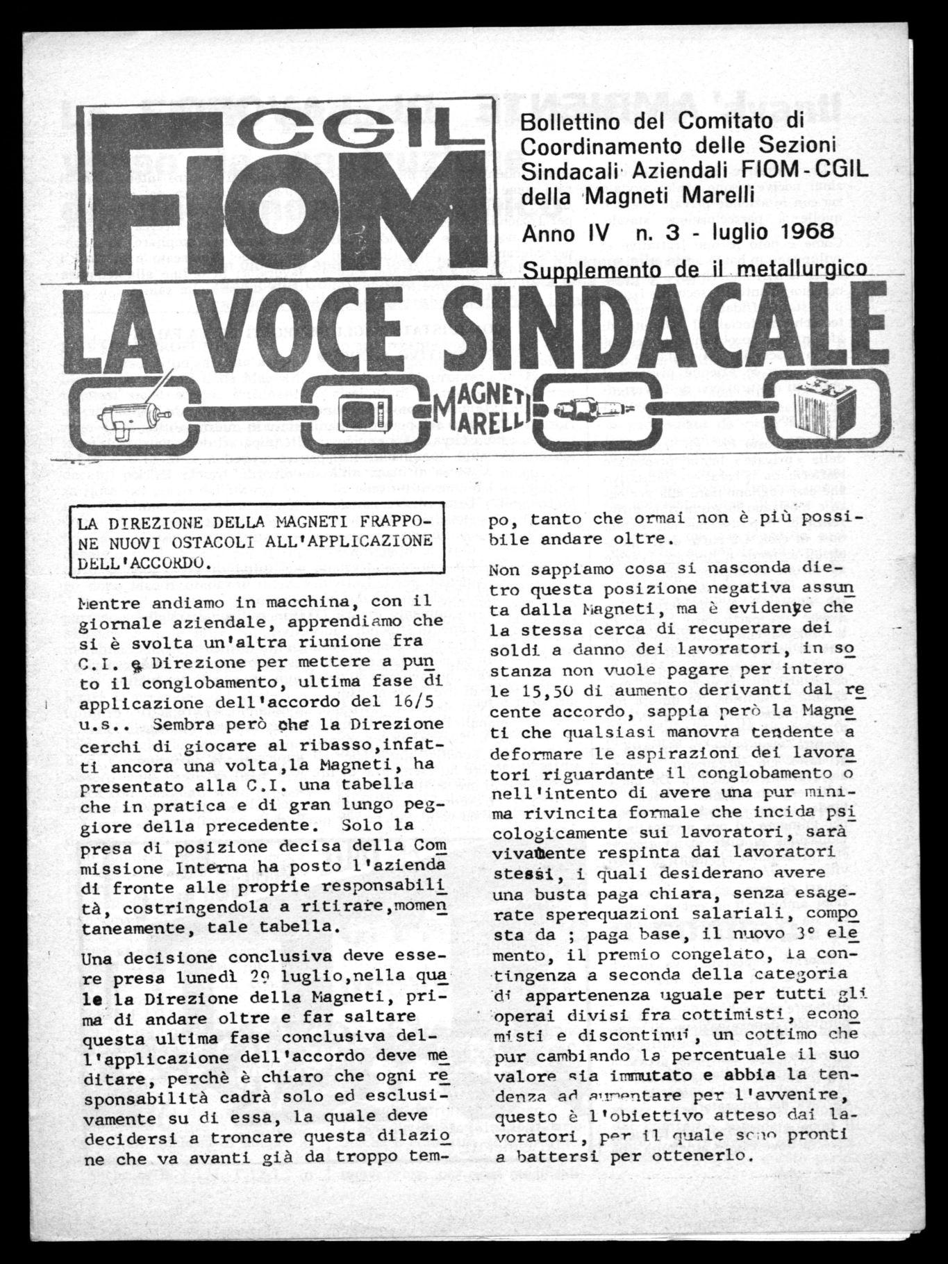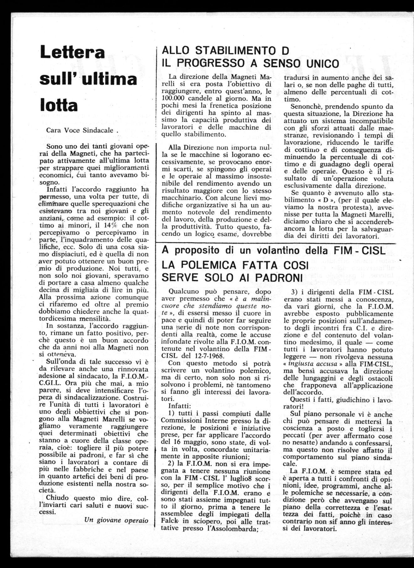 Sull'onda di tale successo vi è da rilevare anche una rinnovata adesione al sindacato, la F.I.O.M.C.GI.L. Ora più che mai, a mio parere, si deve intensificare l'opera di sindacalizzazione. Costruire l'unità di tutti i lavoratori è uno degli obbiettivi che si pongono alla Magneti Marelli se vogliamo veramente raggiungere quei determinati obiettivi che stanno a cuore della classe operaia, cioè: togliere il più potere possibile ai padroni, e far sì che siano i lavoratori a contare di più nelle fabbriche e nel paese in quanto artefici dei beni di produzione esistenti nella nostra società.