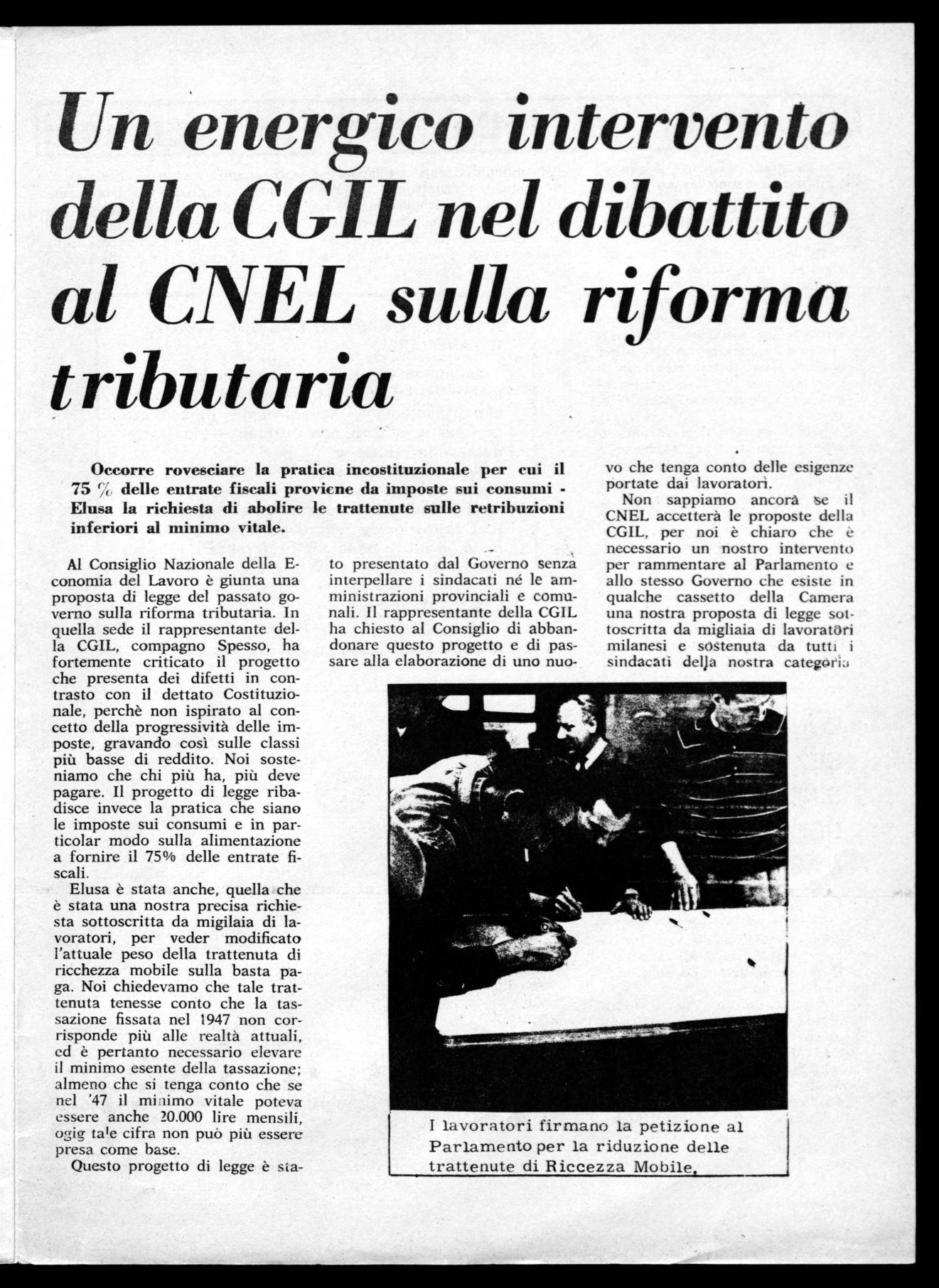 Al Consiglio Nazionale della Economia del Lavoro è giunta una proposta di legge del passato governo sulla riforma tributaria. In quella sede il rappresentante della CGIL, compagno Spesso, ha fortemente criticato il progetto che presenta dei difetti in contrasto con il dettato Costituzionale, perchè non ispirato al concetto della progressività delle imposte, gravando così sulle classi più basse di reddito. Noi sosteniamo che chi più ha, più deve pagare. Il progetto di legge ribadisce invece la pratica che siano le imposte sui consumi e in particolar modo sulla alimentazione a fornire il 75% delle entrate fiscali.
