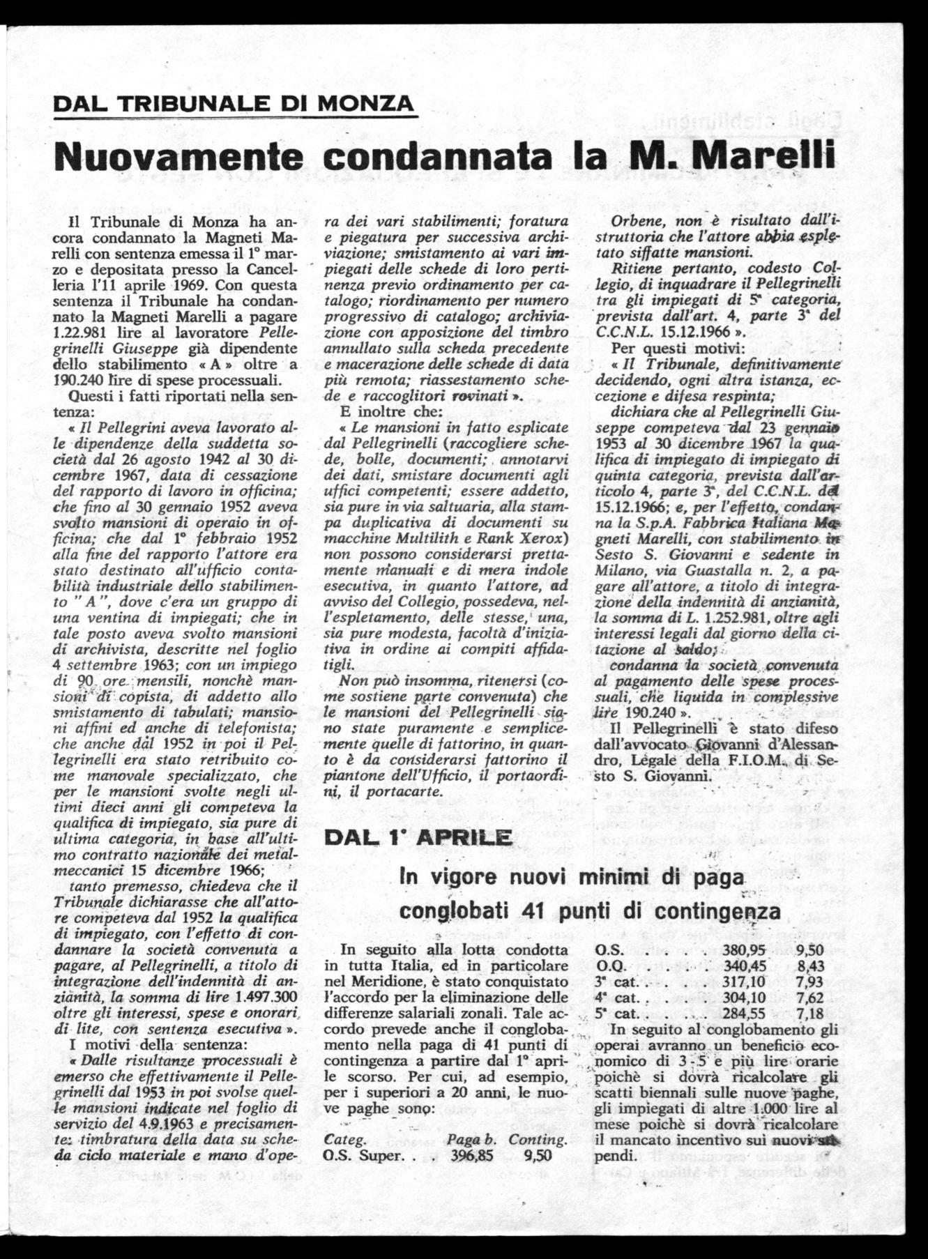 Il Tribunale di Monza ha ancora condannato la Magneti Marelli con sentenza emessa il 1° marzo e depositata presso la Cancelleria l'11 aprile 1969. Con questa sentenza il Tribunale ha condannato la Magneti Marelli a pagare 1.22.981 lire al lavoratore Pellegrinelli Giuseppe già dipendente dello stabilimento « A » oltre a 190.240 lire dí spese processuali.