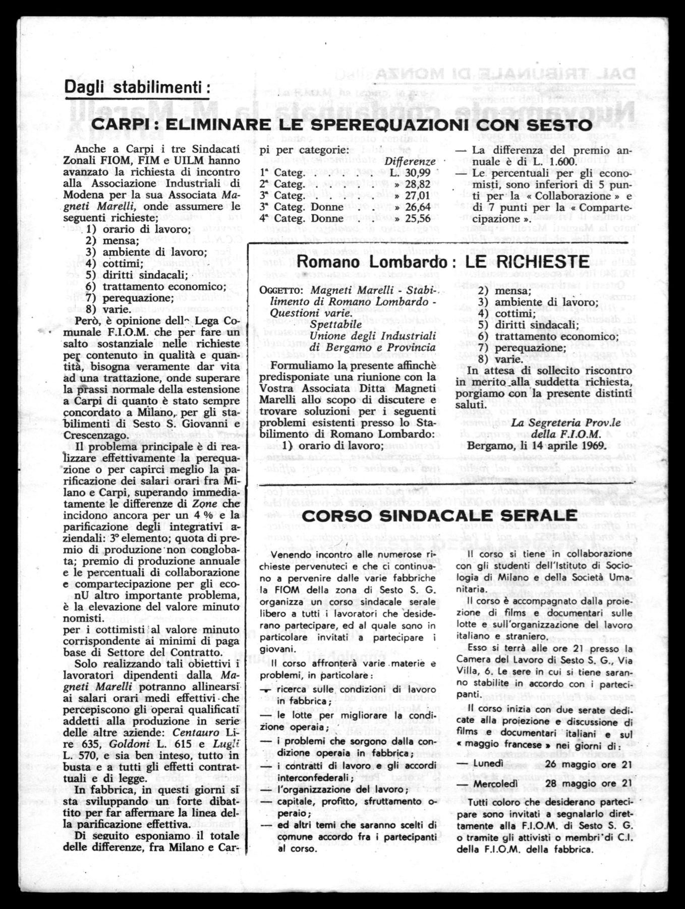 Solo realizzando tali obiettivi i lavoratori dipendenti dalla Magneti Marelli potranno allinearsi ai salari orari medi effettivi che percepiscono gli operai qualificati addetti alla produzione in serie delle altre aziende: Centauro Lire 635, Goldoni L. 615 e Lug'; L. 570, e sia ben inteso, tutto in busta e a tutti gli effetti contrattuali e di legge.