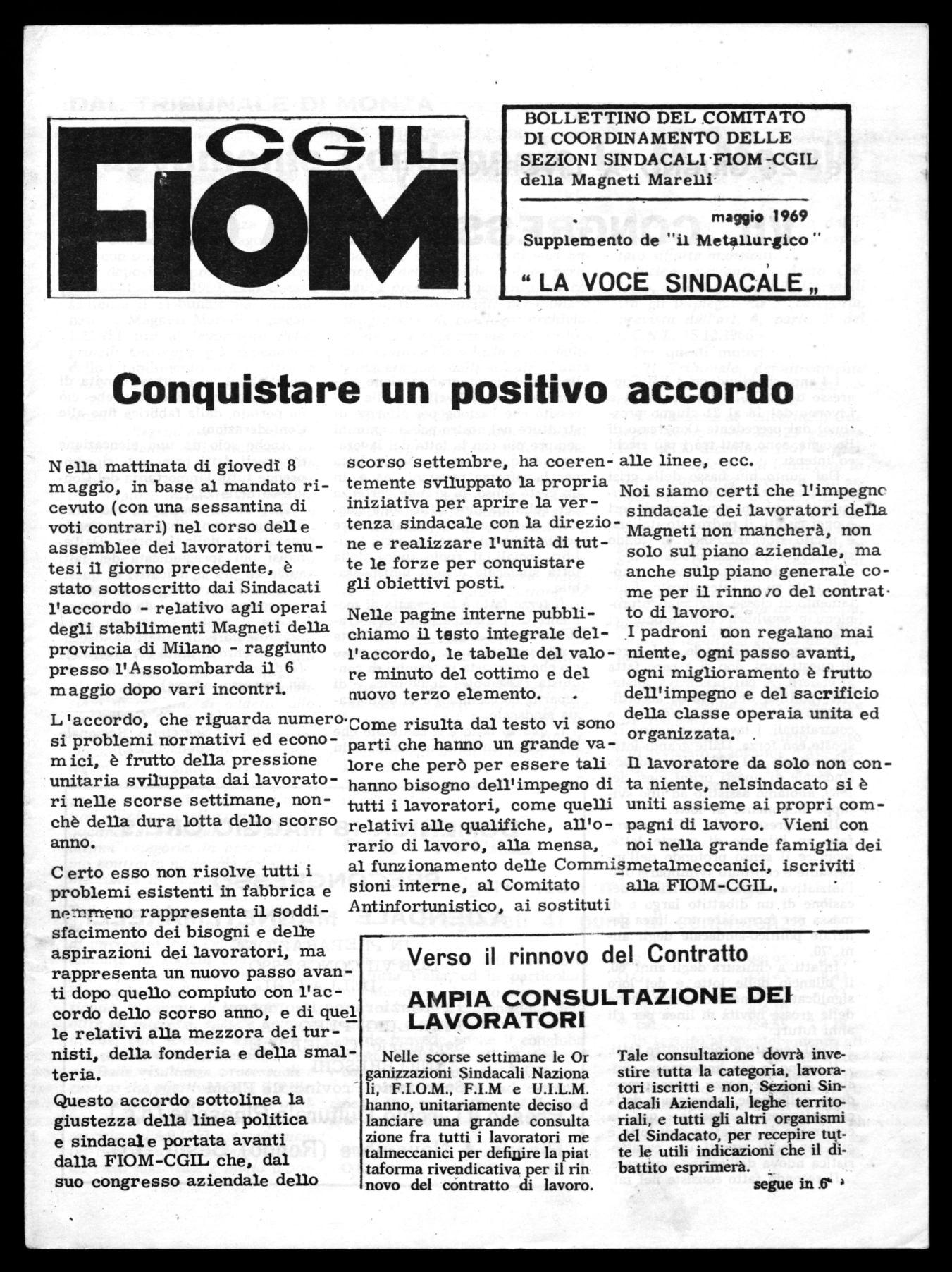 N ella mattinata di giovedì 8 maggio, in base al mandato ricevuto (con una sessantina di voti contrari) nel corso delle assemblee dei lavoratori tenutesi il giorno precedente, è stato sottoscritto dai Sindacati l'accordo - relativo agli operai degli stabilimenti Magneti della provincia di Milano - raggiunto presso l'Assolombarda il 6 maggio dopo vari incontri.