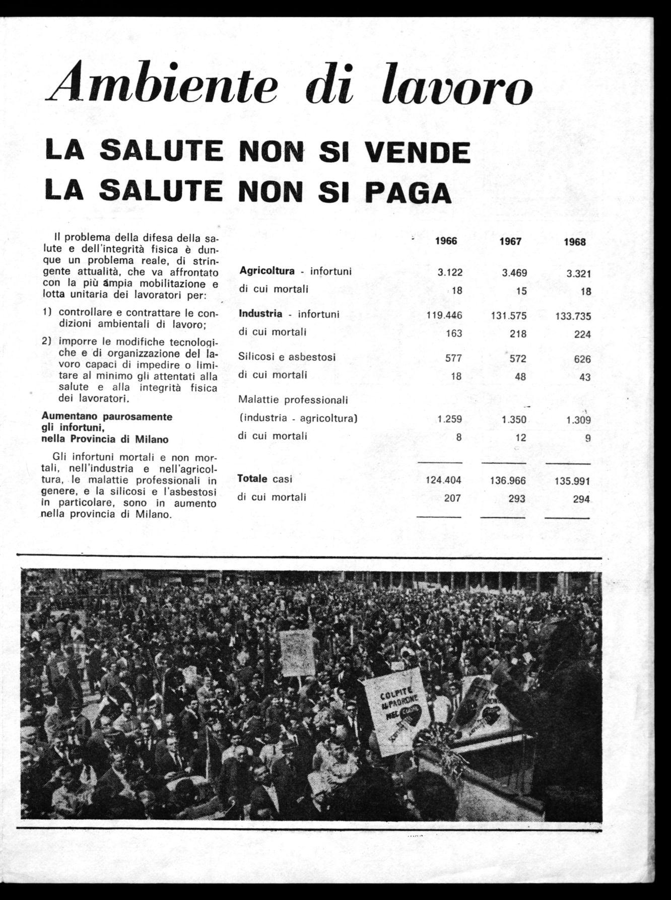 Gli infortuni mortali e non mortali, nell'industria e nell'agricoltura, le malattie professionali in genere, e la silicosi e ('asbestosi in particolare, sono in aumento nella provincia di Milano.