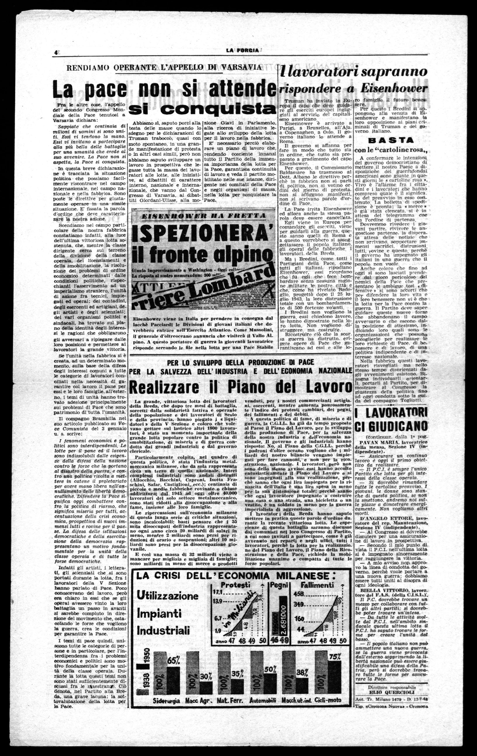 costituiscono l'impegno dei lavoratori della Breda di battersi a fondo per la salvezza della pace e della indipendenza nazionale, per lo sviluppo della produzione di pace. Questo impegno i lavoratori della Breda lo rinnoveranno di fronte al cgauleiter » Eisenhower.