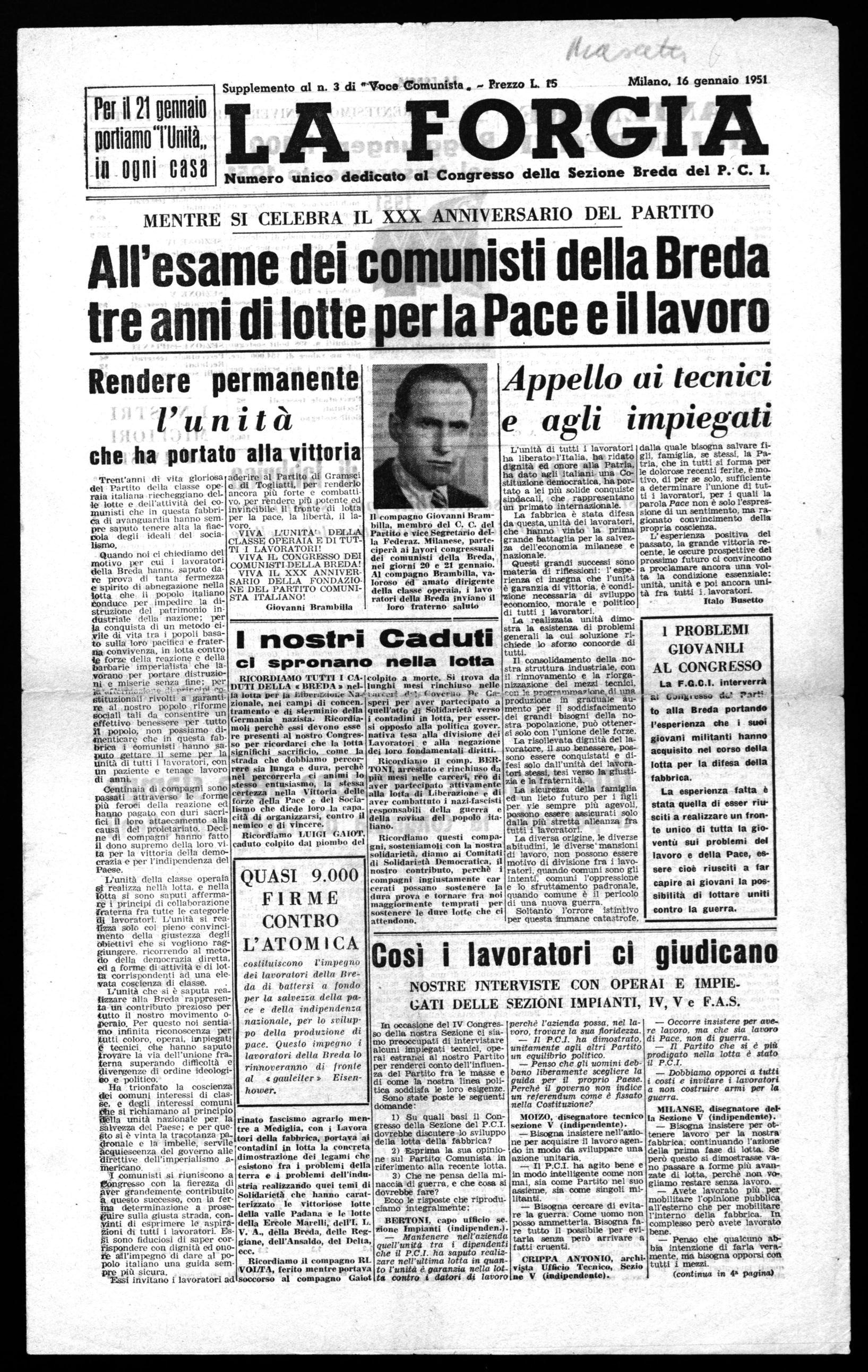 11 compagno Giovanni Branibilla, membro del C. C. del Partito e vice Segretario della Federaz. Milanese, parteciperà ai lavori congressuali dei comunisti della Breda, nei giorni 20 e 21 gennaio. Al compagno Brambilla, valoroso ed" amato dirigente della classe operaia, i lavo ratori della Breda inviano il loro fraterno saluto