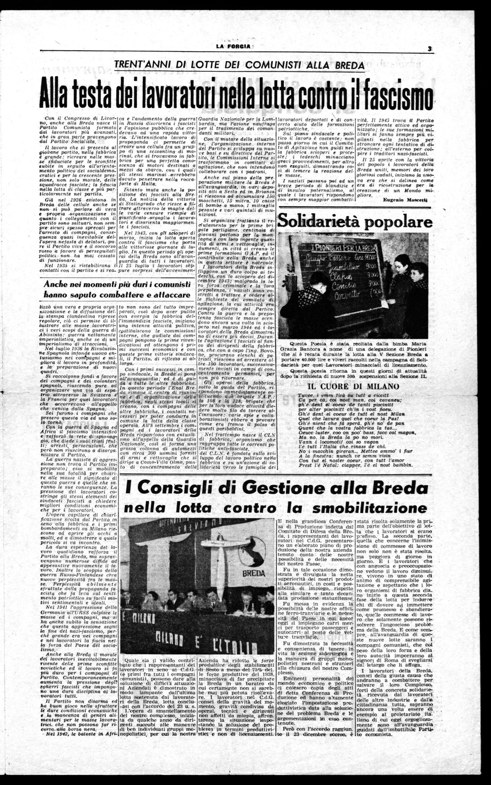 Nel 1943, con gli scioperi di marzo, inizia la lotta aperta contro il fascismo che porta alle vittoriose giornate di luglio. In questo periodo gli operai della Breda sono all'avanguardia di tutti .i lavoratori. 11 25 luglio i lavoratori sèppure sorpresi dell'avvenimen-