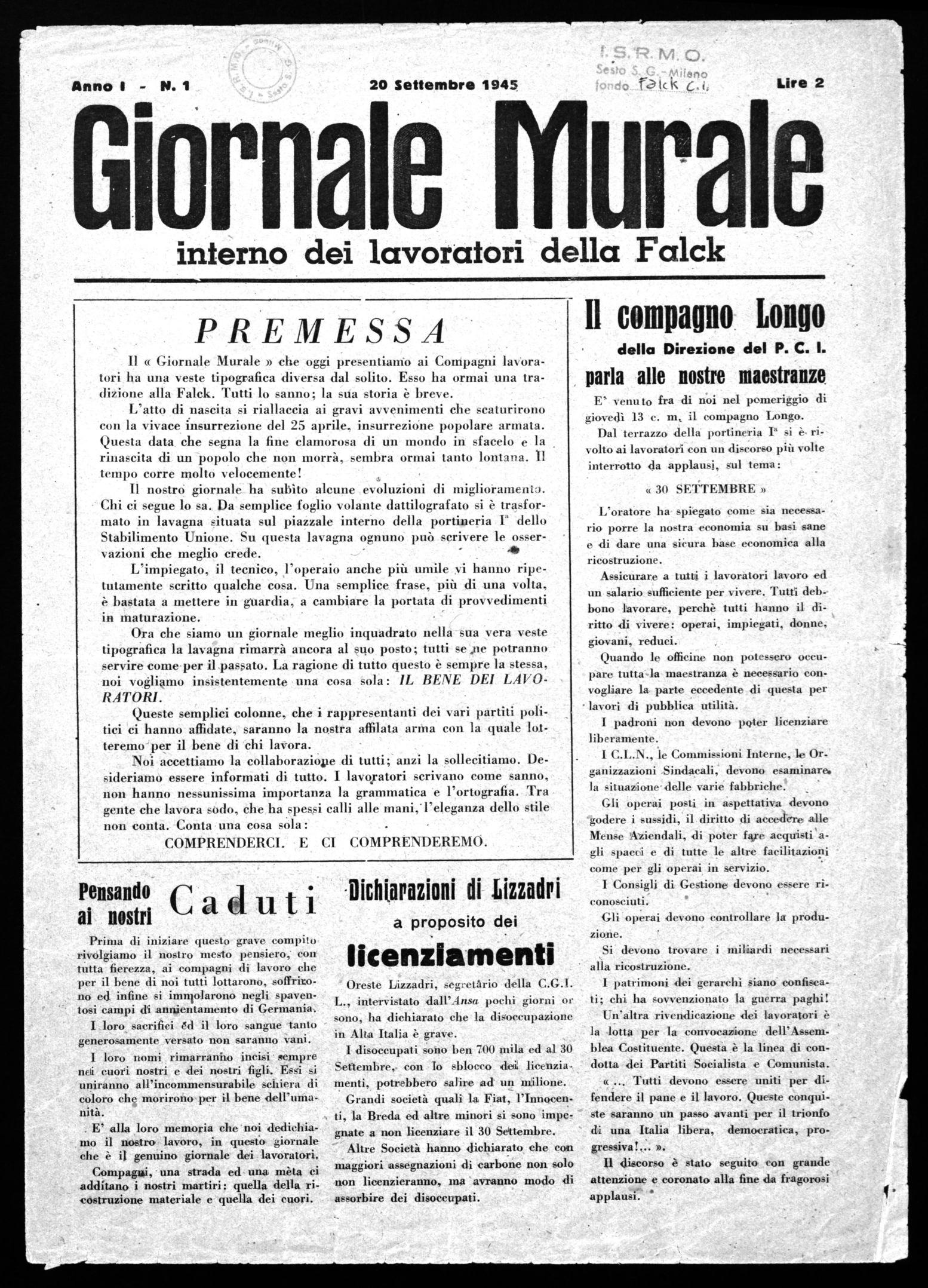 Il « Giornale Murale » che oggi presentianio ai Compagni lavoratori ha una veste tipografica diversa dal solito. Esso ha ormai una tradizione alla Falck. Tutti lo sanno; la stia storia è breve.