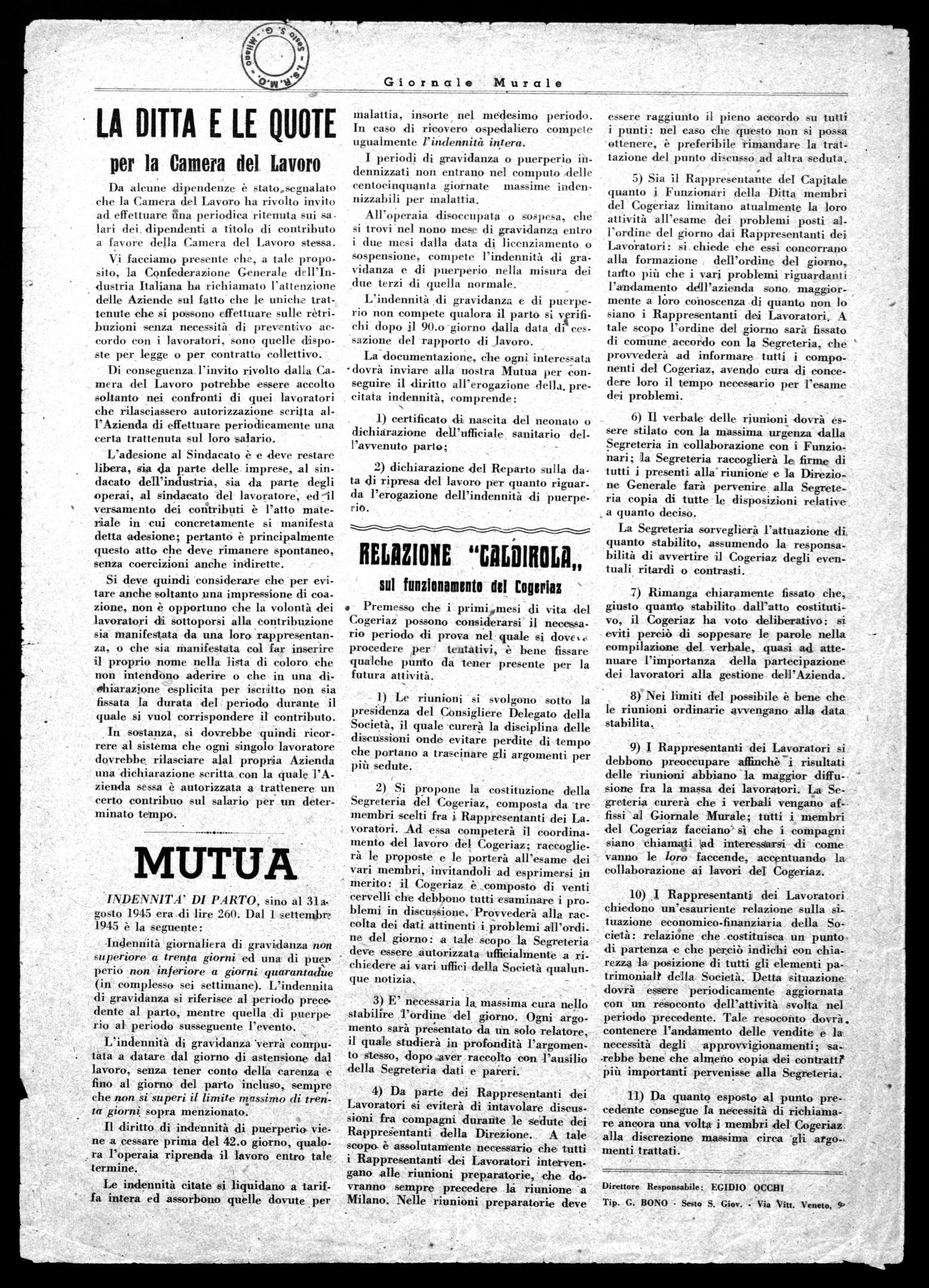 I Rappresentanti dei Lavoratori si debbono preoccupare affinchè i risultati delle riunioni abbiano la maggior diffusione fra la massa dei lavoratori. La Segreteria curerà che i verbali vengano affissi al Giornale Murale; tutti i membri del Cogeriaz facciano' sì che i compagni siano chiamati ad interessarsi di come vanno le loro faccende, accentuando la collaborazione ai lavori del Cogeriaz.