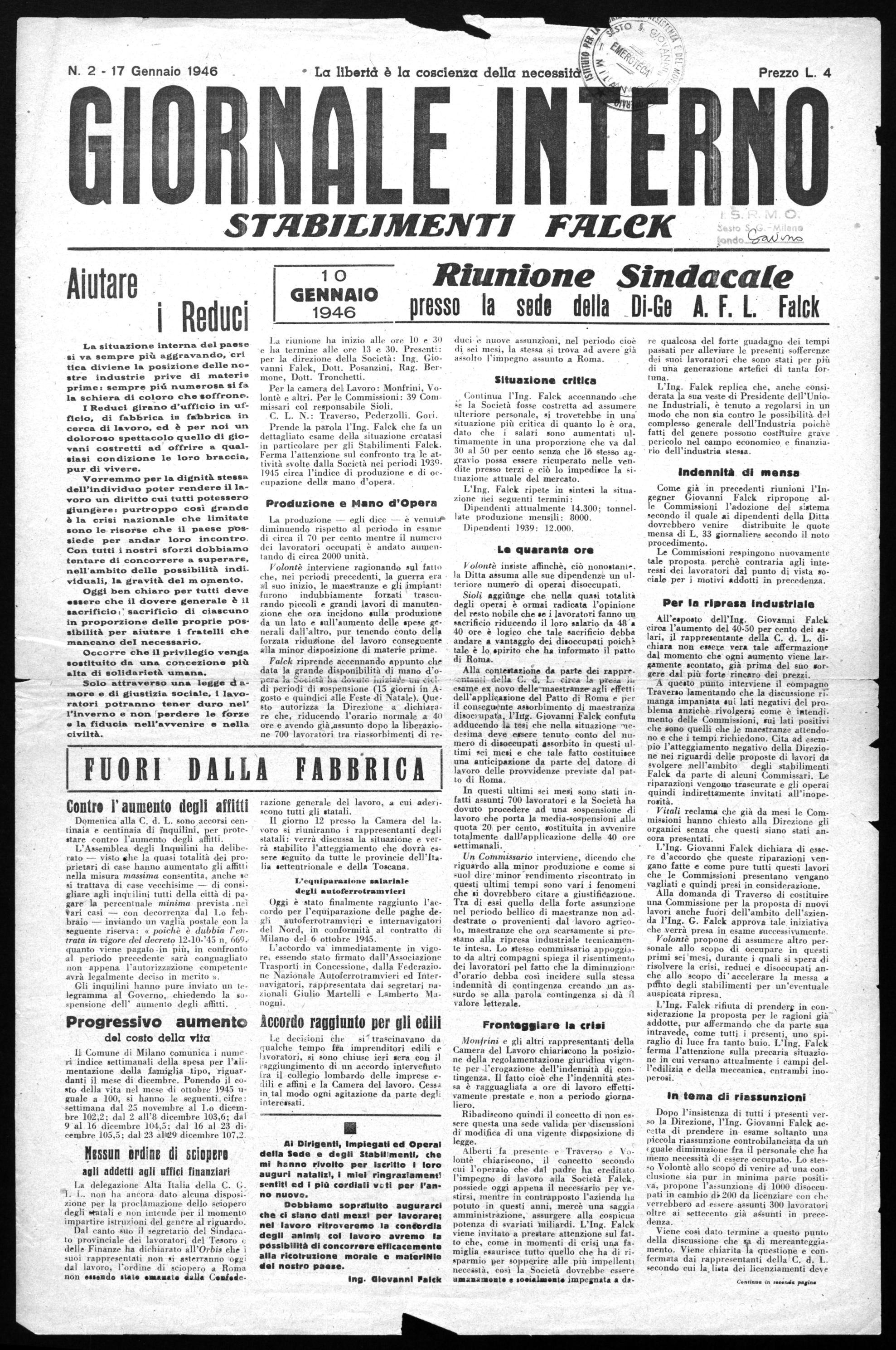 L'Ing. Falck replica che, anche considerata la sua veste di Presidente dell'Unione Industriali, è tenuto a regolarsi in un modo che non sia contro le possibilità. del complesso generale dell'Industria poichè fatti del genere possono costituire grave pericolo nel campo economico, e finanziario dell'industria stessa.