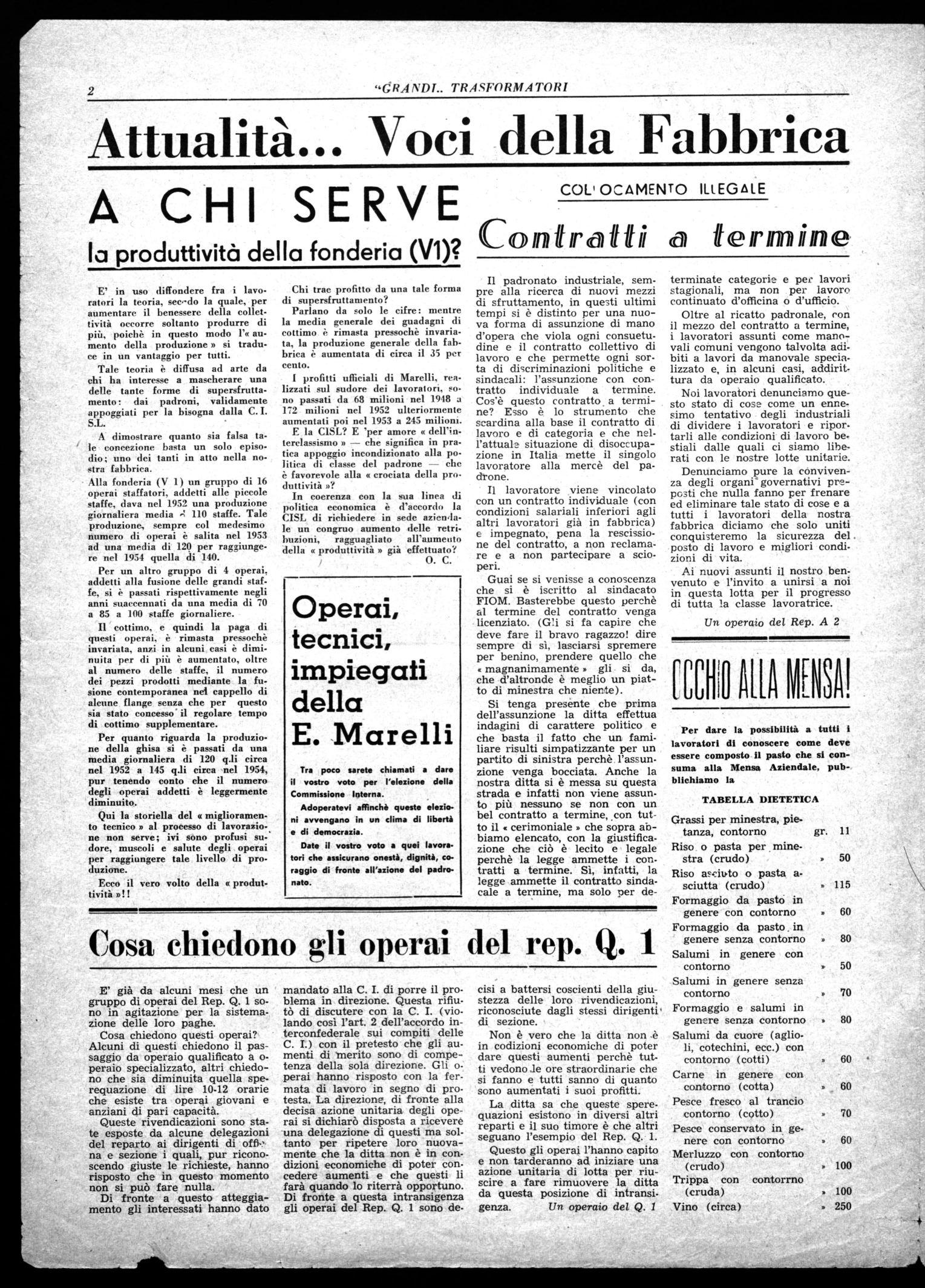 Lavoratori della Ercole Marelli, ritorna a voi, dopo una sosta prolungata, il giornale di Fabbrica. Esso è mutato nella forma. La testata non sarà più « Fabbrica Unita » (supplemento del giornale di Fabbrica Pirelli) bensì «Grandi Trasformatori». Un nome piuttosto altisonante, è vero, che vuol essere l'indicazione, non tanto del settore di produzione tipico dell'Azienda, quanto di una attività che richiede particolari studi e capacità tecniche e Che dà vita e movimento ad altre importanti opere del progresso e della creazione umana. Per il resto, nulla di sostanziale è cambiato. «Grandi Trasformatori» vuol essere, come per il passato, la voce dei lavoratori, uno strumento della loro emancipazione, una bandiera dí unità e di solidarietà.