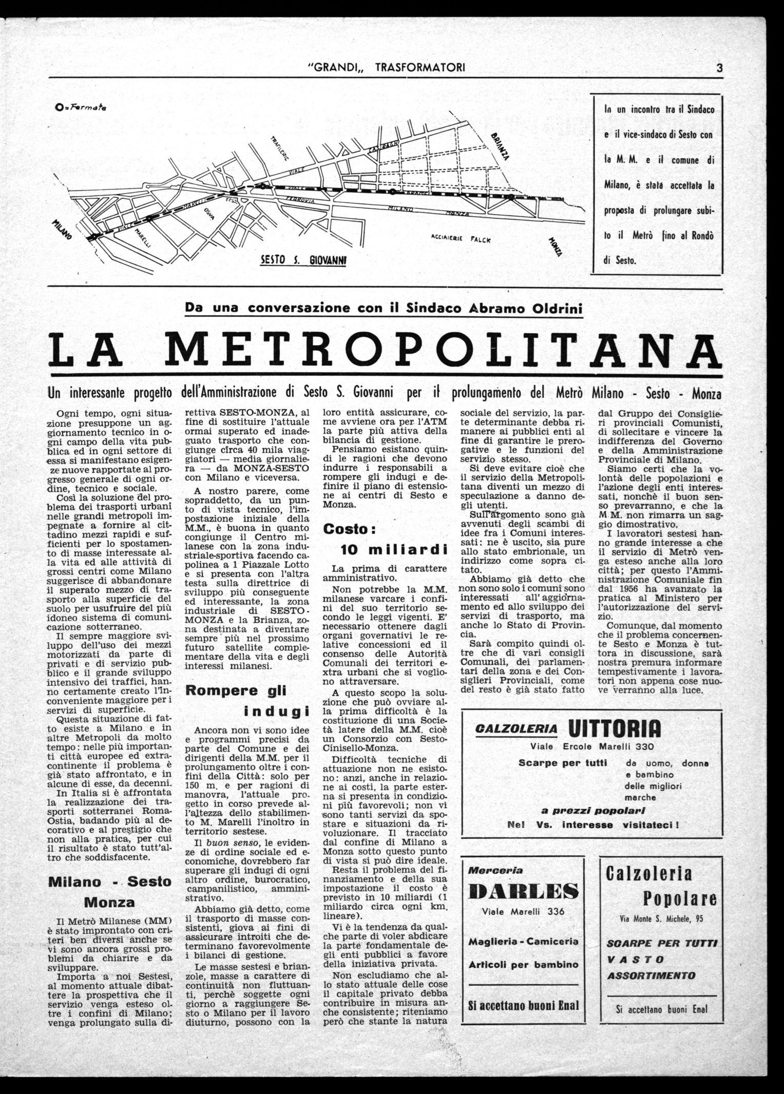 I lavoratori sestesi hanno grande interesse a che il servizio di Metrò venga esteso anche alla loro città; per questo l'Amministrazione Comuniale fin dal 1956 ha avanzato la pratica al Ministero per l'autorizzazione del servizio.