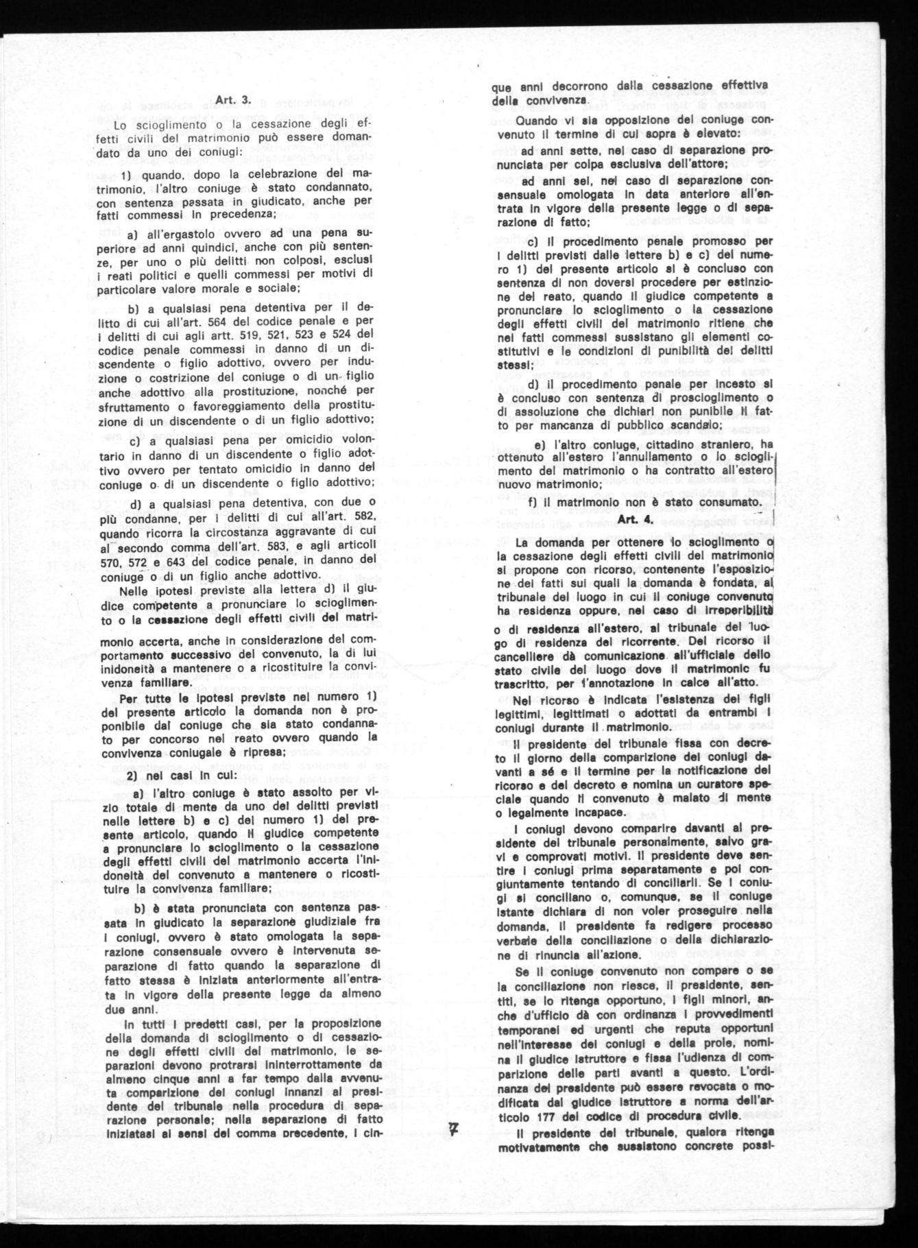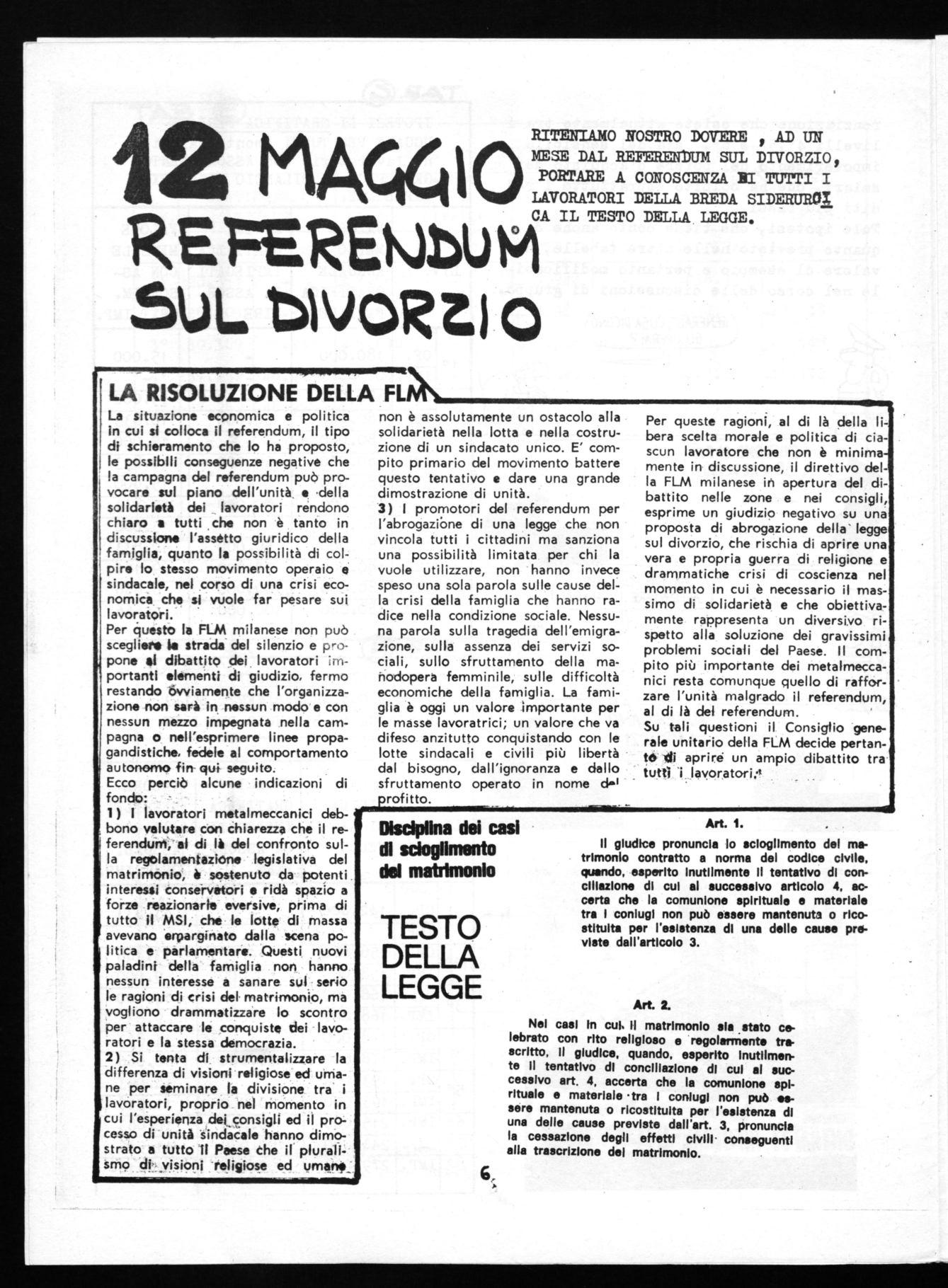 RITENIAMO NOSTRO DOVERE , AD UN MESE DAL REFERENDUM SUL DIVORZIO, PORTARE A CONOSCENZA BI TUTTI I LAVORATORI DELLA BREDA SIDERUEOI CA IL TESTO DELLA LEGGE.
