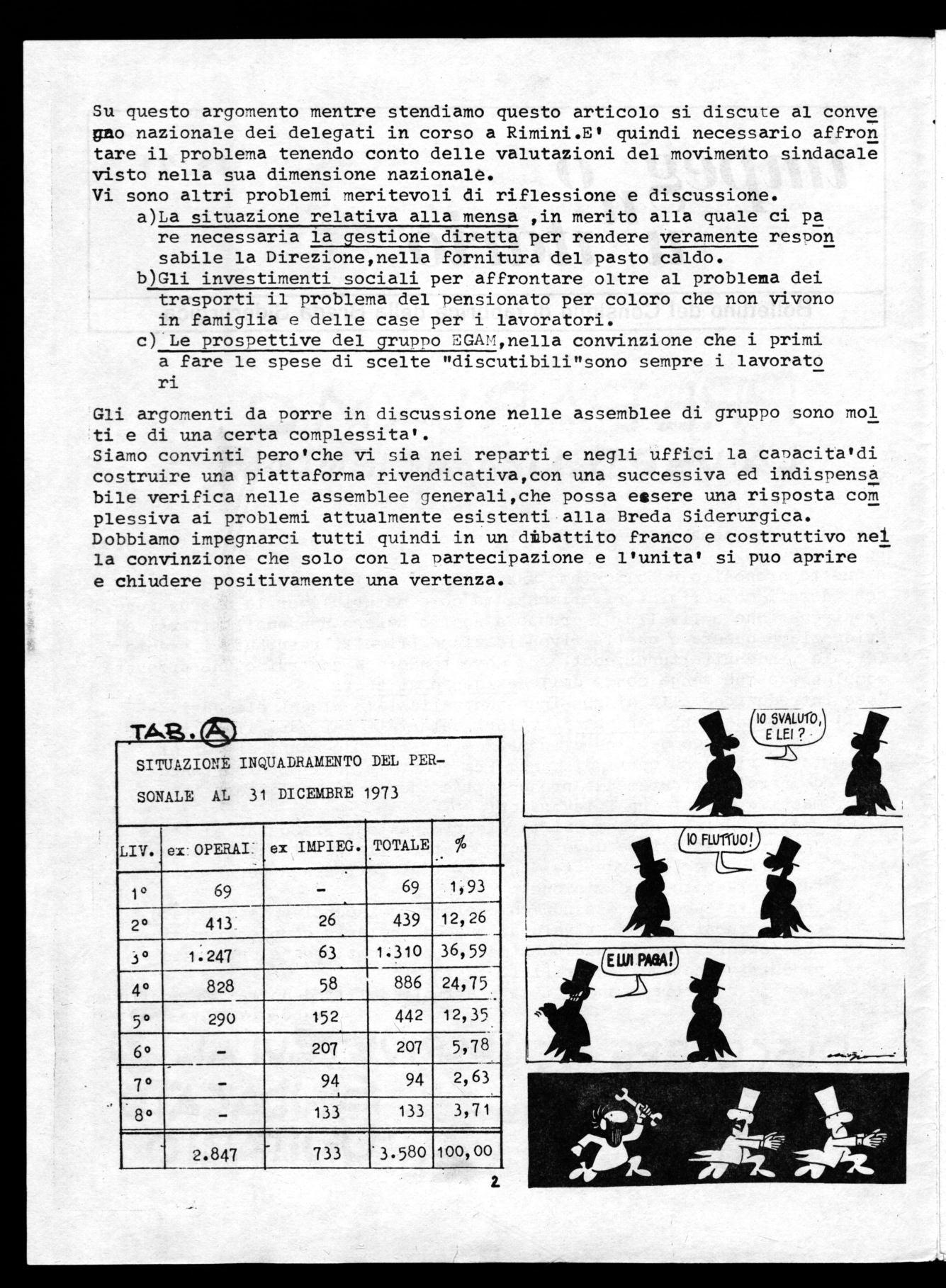 Siamo convinti pero'che vi sia nei reparti e negli uffici la canacita'di costruire una piattaforma rivendicativa,con una successiva ed indispensa bile verifica nelle assemblee generali,che possa essere una risposta coi plessiva ai problemi attualmente esistenti alla Breda Siderurgica. Dobbiamo impegnarci tutti quindi in un dibattito franco e costruttivo nei la convinzione che solo con la Partecipazione e l'unita' si puo aprire e chiudere positivamente una vertenza.