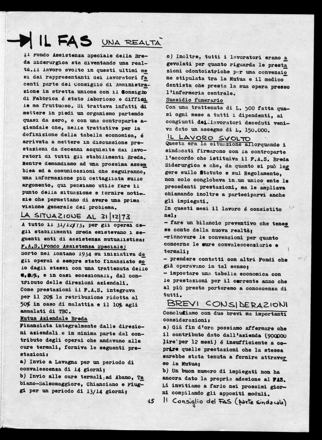 Questa era la situazione allorquando i sindacati firmarono con la controparte l'accordo che istituiva il F.A.S. Breda Siderurgica e che, da quanto si puro leL Bere sullo Statuto e sul Regolamento, non solo conglobava in_un unico ente le precedenti prestazioni, ma le ampliava chiamando inoltre a parteciparvi anche gli impiegati.
