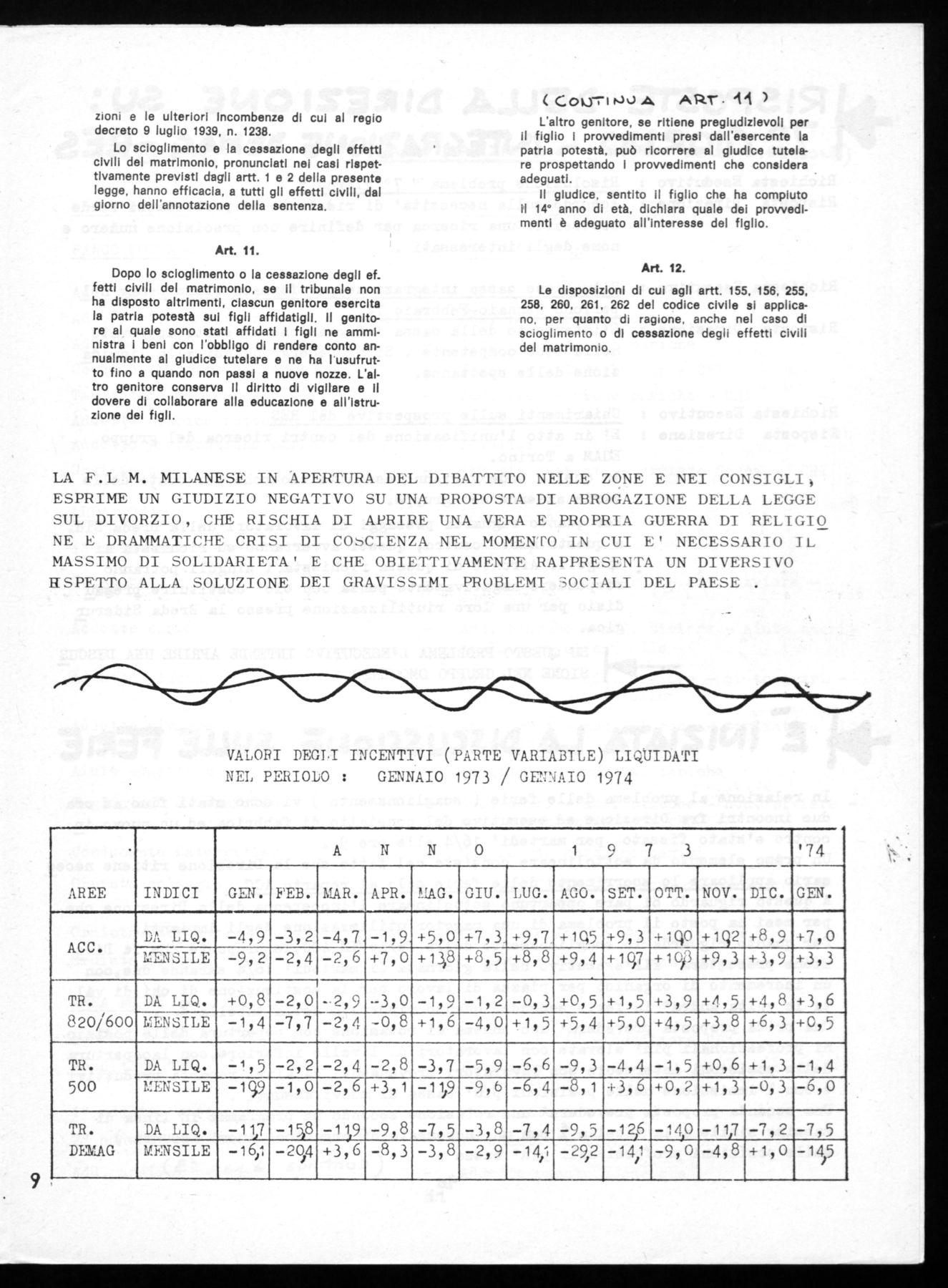 Per queste ragioni, al di là della libera scelta morale e politica di ciascun lavoratore che non è minimamente in discussione, il direttivo della FLM milanese in apertura del dibattito nelle zone e nei consigli, esprime un giudizio negativo su una proposta di abrogazione della legge sul divorzio, che rischia di aprire una vera e propria guerra di religione e drammatiche crisi di coscienza nel momento in cui è necessario il massimo di solidarietà e che obiettivamente rappresenta un diversivo rispetto alla soluzione dei gravissimi problemi sociali del Paese. Il compito più importante dei metalmeccanici resta comunque quello di rafforzare l'unità malgrado il referendum, al di là dei referendum.