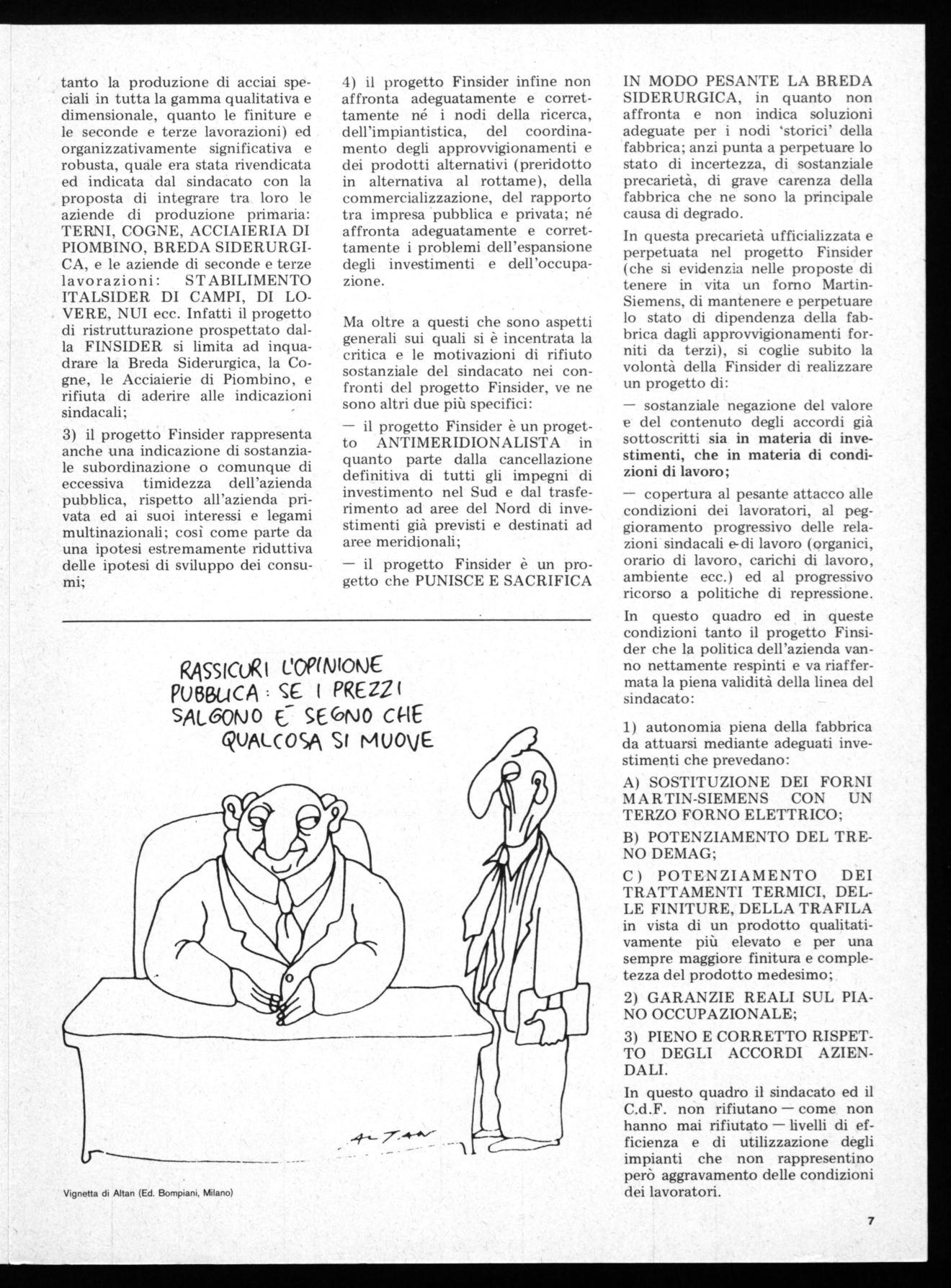 Vignetta tratta da «Conoscete Carlo Marx» (Ed. Ottaviano, Milano)tanto la produzione di acciai speciali in tutta la gamma qualitativa e dimensionale, quanto le finiture e le seconde e terze lavorazioni) ed organizzativamente significativa e robusta, quale era stata rivendicata ed indicata dal sindacato con la proposta di integrare tra loro le aziende di produzione primaria: TERNI, COGNE, ACCIAIERIA DI PIOMBINO, BREDA SIDERURGICA, e le aziende di seconde e terze lavorazioni: STABILIMENTO ITALSIDER DI CAMPI, DI LOVERE, NUI ecc. Infatti il progetto di ristrutturazione prospettato dalla FINSIDER si limita ad inquadrare la Breda Siderurgica, la Cogne, le Acciaierie di Piombino, e rifiuta di aderire alle indicazioni sindacali;