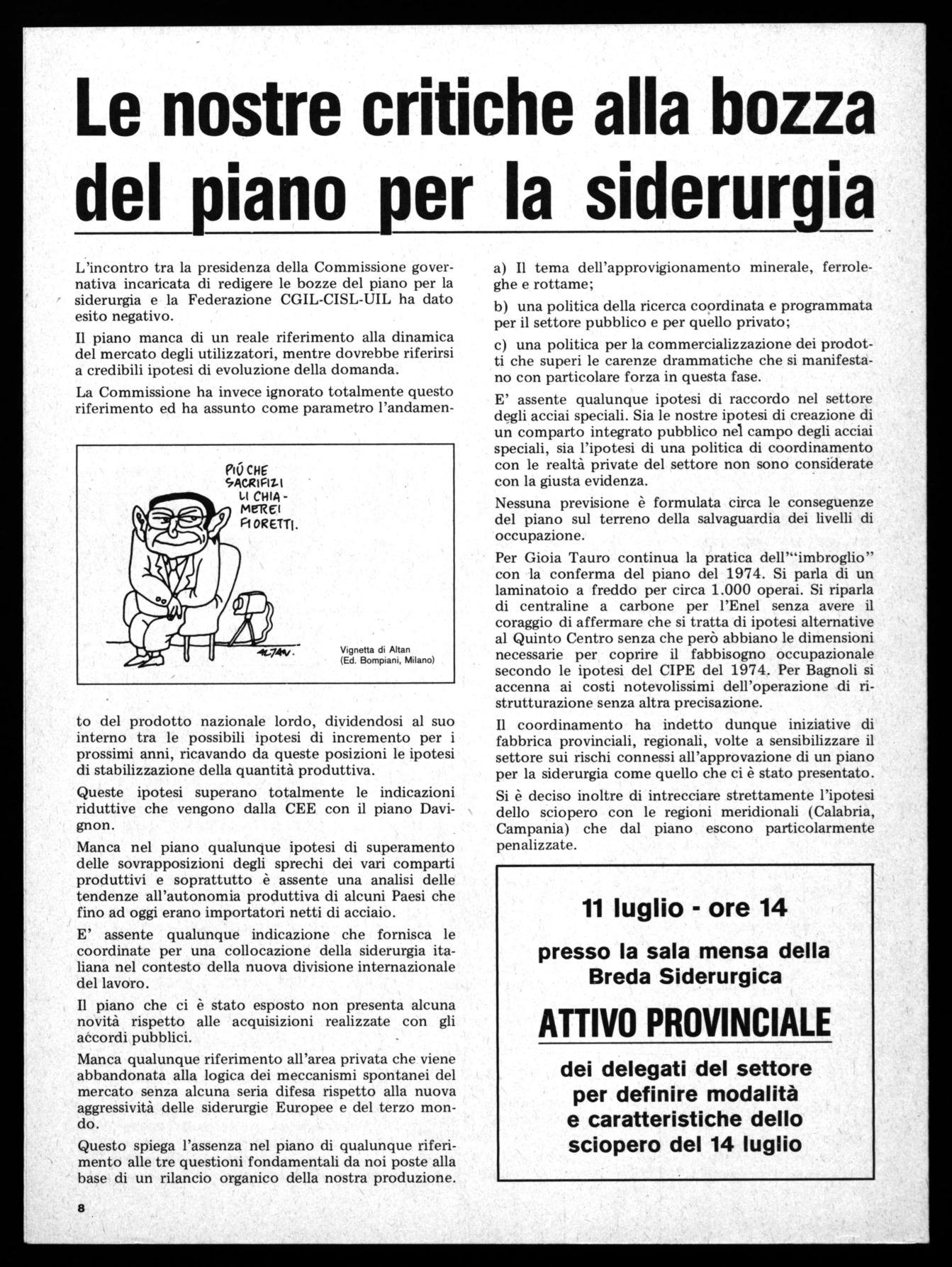 Vignetta di Altan (Ed. Bompiani, Milano)L'incontro tra la presidenza della Commissione governativa incaricata di redigere le bozze del piano per la siderurgia e la Federazione CGIL-CISL-UIL ha dato esito negativo.