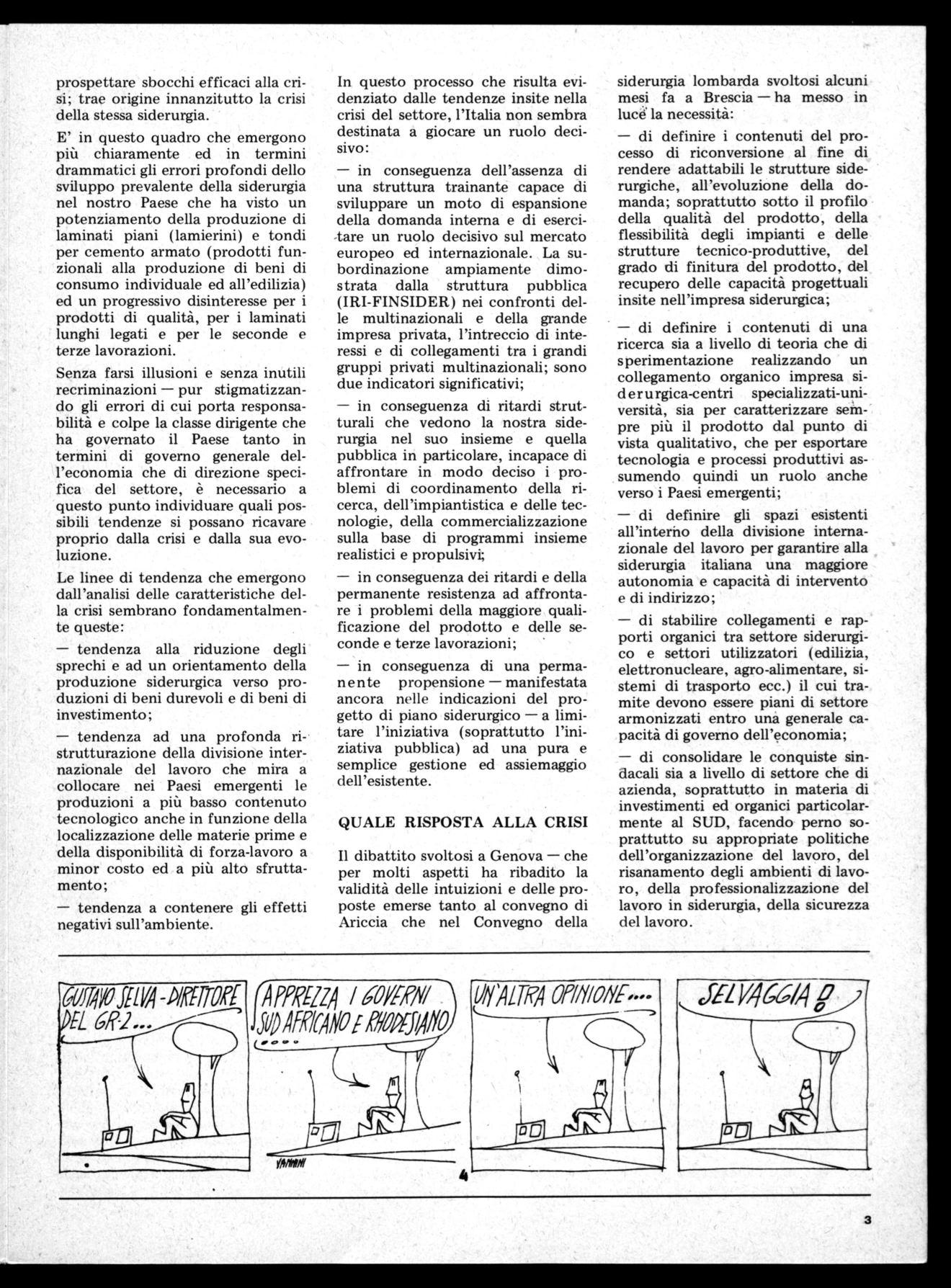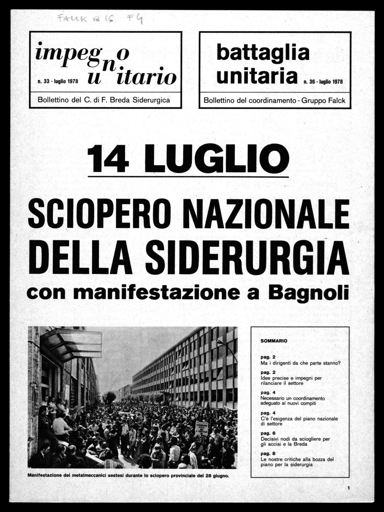 Per questi motivi i problemi della Falck, dei CMI, della Breda non possono e non devono essere problemi isolati e solo dei lavoratori di ogni singola azienda, ma questioni sulle quali tutti i lavoratori siderurgici devono essere impegnati a tutti i livelli, consapevoli che risolvendo questi problemi si dà un contributo alla lotta generale di tutto il movimento sindacale per la trasformazione economica e sociale del paese, per uscire diversi dalla crisi.