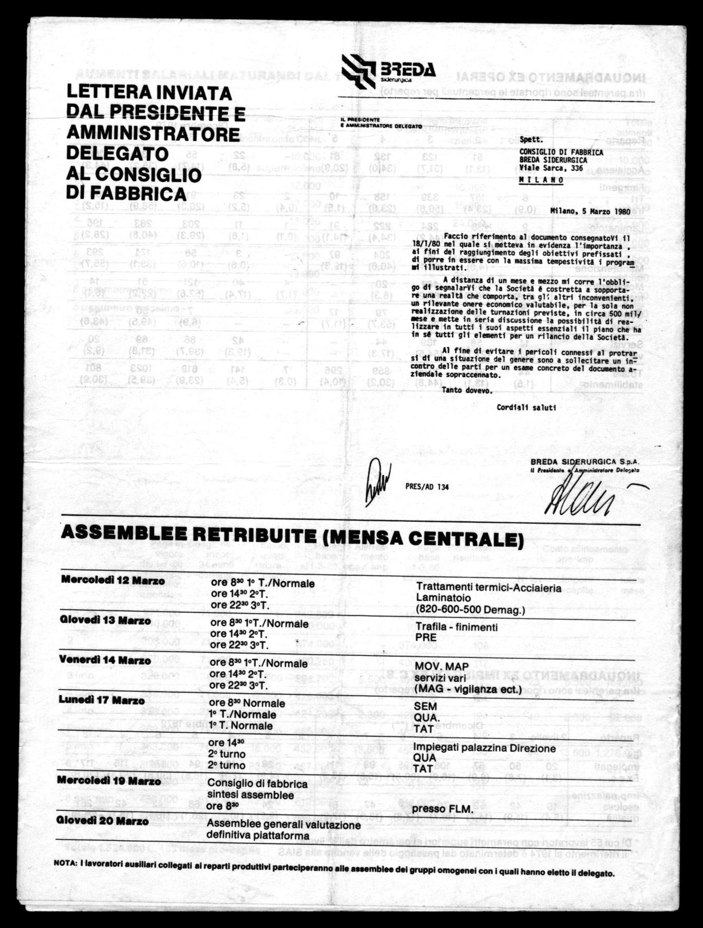 Mercoledì 19 Marzo Consiglio di fabbrica sintesi assemblee ore 8" presso FLM.