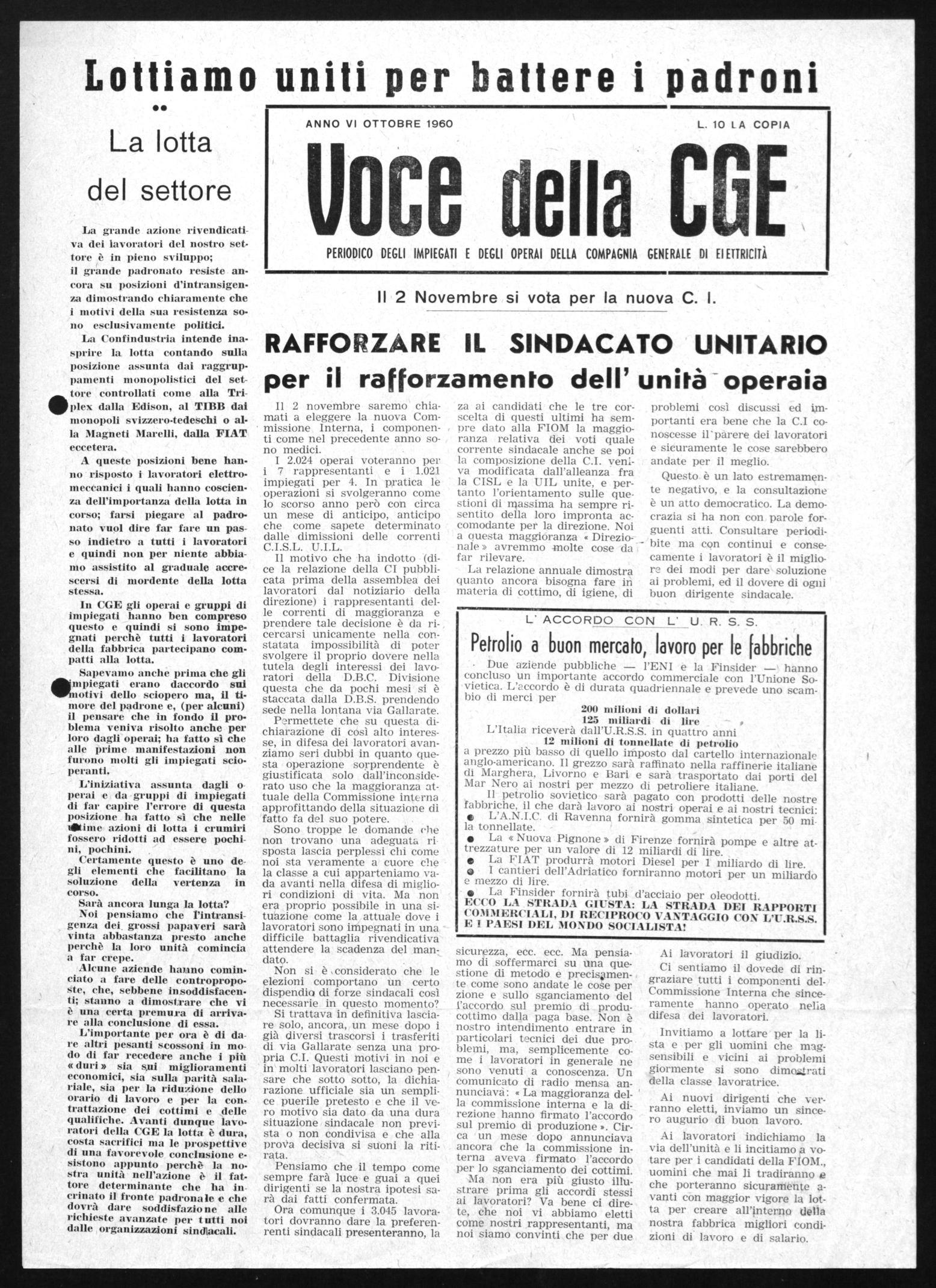 Ai lavoratori indichiamo la via dell'unità e li incitiamo a votare per i candidati della FIOM., uomini che mai li tradiranno e che porteranno sicuramente avanti con maggior vigore la lotta per creare all'lnterno della nostra fabbrica migliori condizioni di lavoro e di salario.