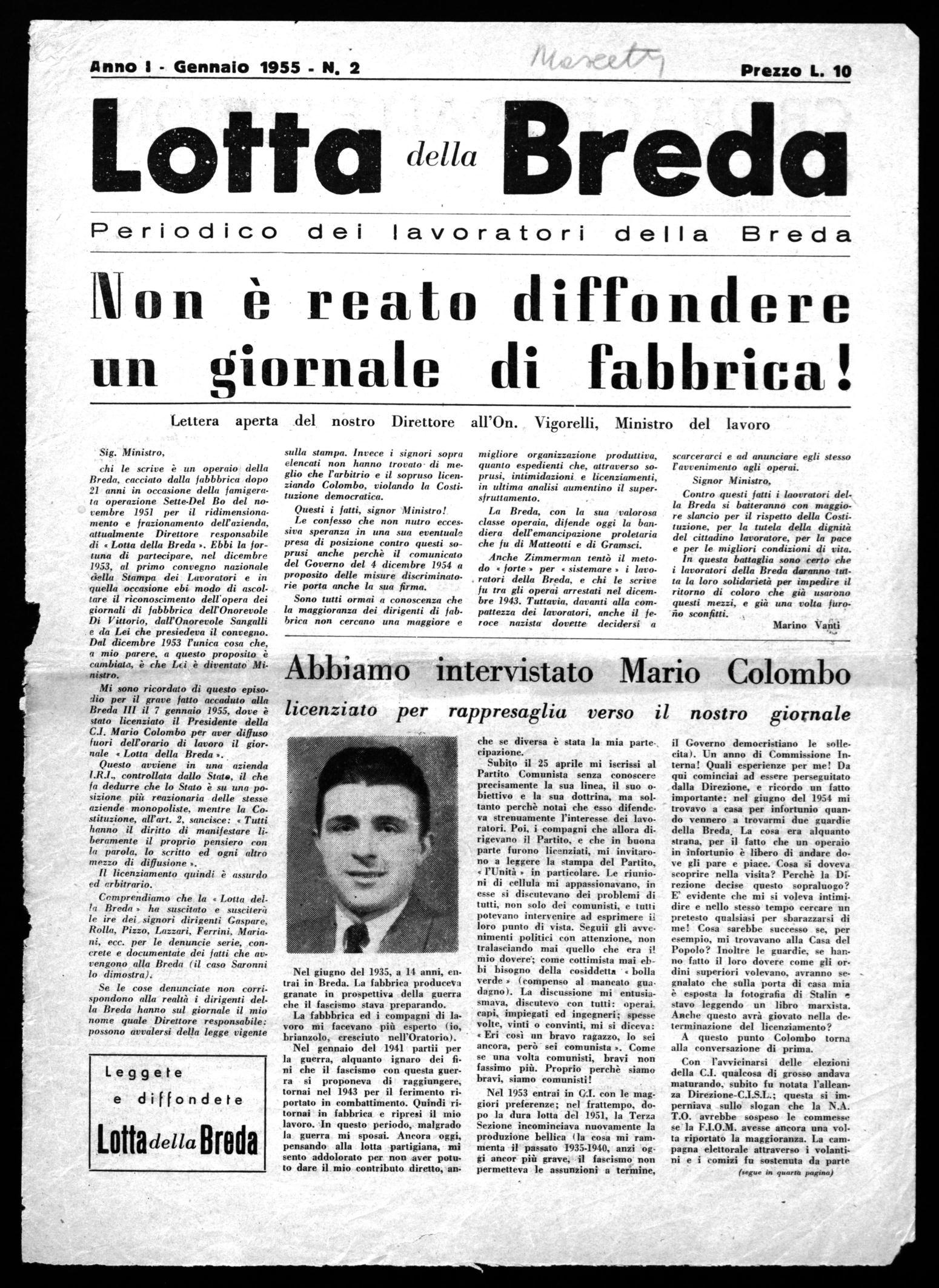 Sig. Ministro, chi le scrive è un operaio della Breda, cacciato dalla fabbbrica dopo 21 anni in occasione della famigerato operazione Sette-Del Bo del novembre 1951 per il ridimensionamento e frazionamento dell'azienda, attualmente Direttore responsabile di « Lotta della Breda ». Ebbi la fortuna di partecipare, nel dicembre 1953, al primo convegno nazionale della Stampa dei Lavoratori e in quella occasione ebi modo di ascoltare il riconoscimento dell'opera dei giornali di fabbbrica dell'Onorevole Di Vittorio, dall'Onorevole Sangalli e da Lei che presiedeva il convegno. Dal dicembre 1953 l'unica cosa che, a mio parere, a questo proposito è cambiata, è che Lei è diventate Mi-Moro.
