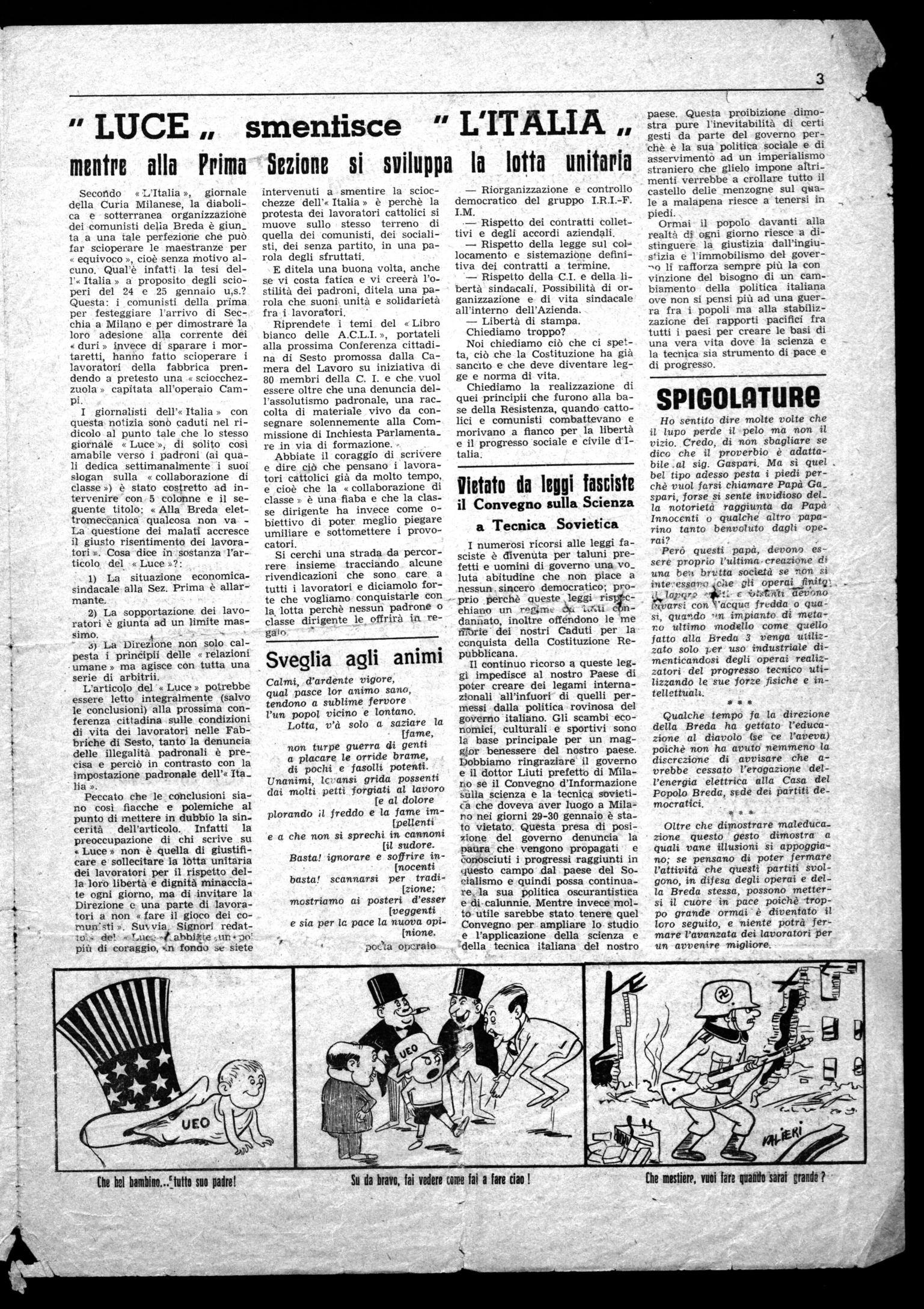 Secondo « L'Italia », giornale della Curia Milanese, la diabolica e sotterranea organizzazione dei comunisti della Breda è giun_ ta a una tale perfezione che può far scioperare le maestranze per « equivoco », cioè senza motivo alcuno. Qual'è infatti la tesi dell'« Italia » a proposito degli scioperi del 24 e 25 gennaio u,s.? Questa: i comunisti della prima per festeggiare l'arrivo di Secchia a Milano e per dimostrare la loro adesione alla corrente dei « duri » invece di sparare i mortaretti, hanno fatto scioperare i lavoratori della fabbrica prendendo a pretesto una « sciocchezzuola » capitata all'operaio Campi.