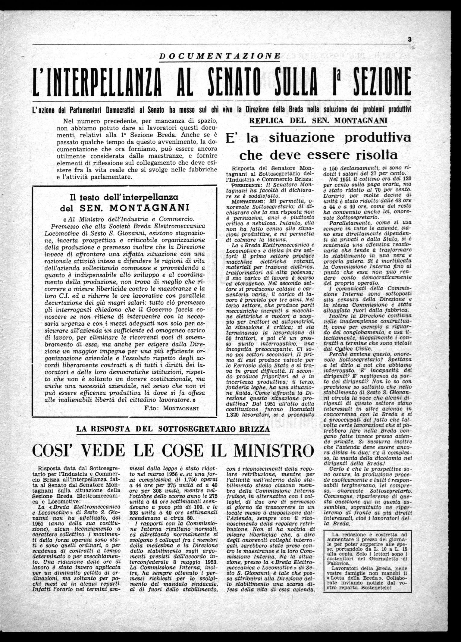 Risposta data dal Sottosegretario per l'Industria e Commercio Brizza all'interpellanza fatta al Senato dal Senatore Montagnani sulla situazione della Sezione Breda Elettromeccanica e Locomotive: La «Breda Elettromeccanica e Locomotive» di Sesto S. Giovanni non ha effettuato, dal 1951 (anno della sua costituzione), alcun licenziamento a carattere collettivo. I movimenti della forza operaia sono stati e sono quelli ordinari, o per scadenza di contratti a tempo determinato o per svecchiamento. Una riduzione delle ore di lavoro è stata invero applicata per un diminuito gettito di ordinazioni, ma soltanto per pochi mesi ed in alcuni reparti. Infatti l'orario nei termini am-
