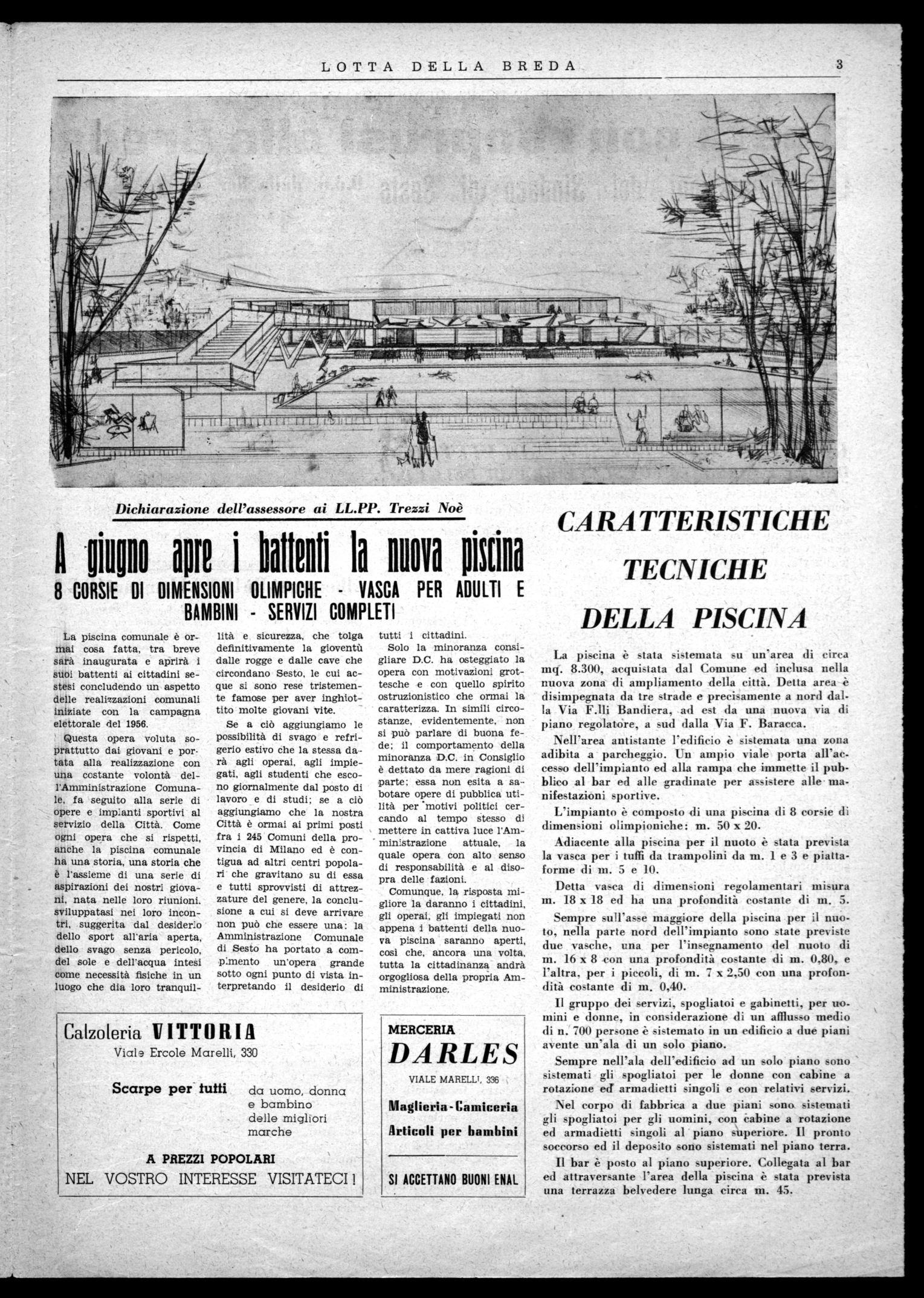 Se a ciò aggiungiamo le possibilità di svago e refrigerio estivo che la stessa darà agli operai, agli impiegati, agli studenti che escono giornalmente dal posto di lavoro e di studi; se a ciò aggiungiamo che la nostra Città è ormai ai primi posti fra i 245 Comuni della provincia di Milano ed è contigua ad altri centri popolari che gravitano su di essa e tutti sprovvisti di attrezzature del genere, la conclusione a cui si deve arrivare non può che essere una: la Amministrazione Comunale di Sesto ha portato a compimento un'opera grande sotto ogni punto di vista interpretando il desiderio di