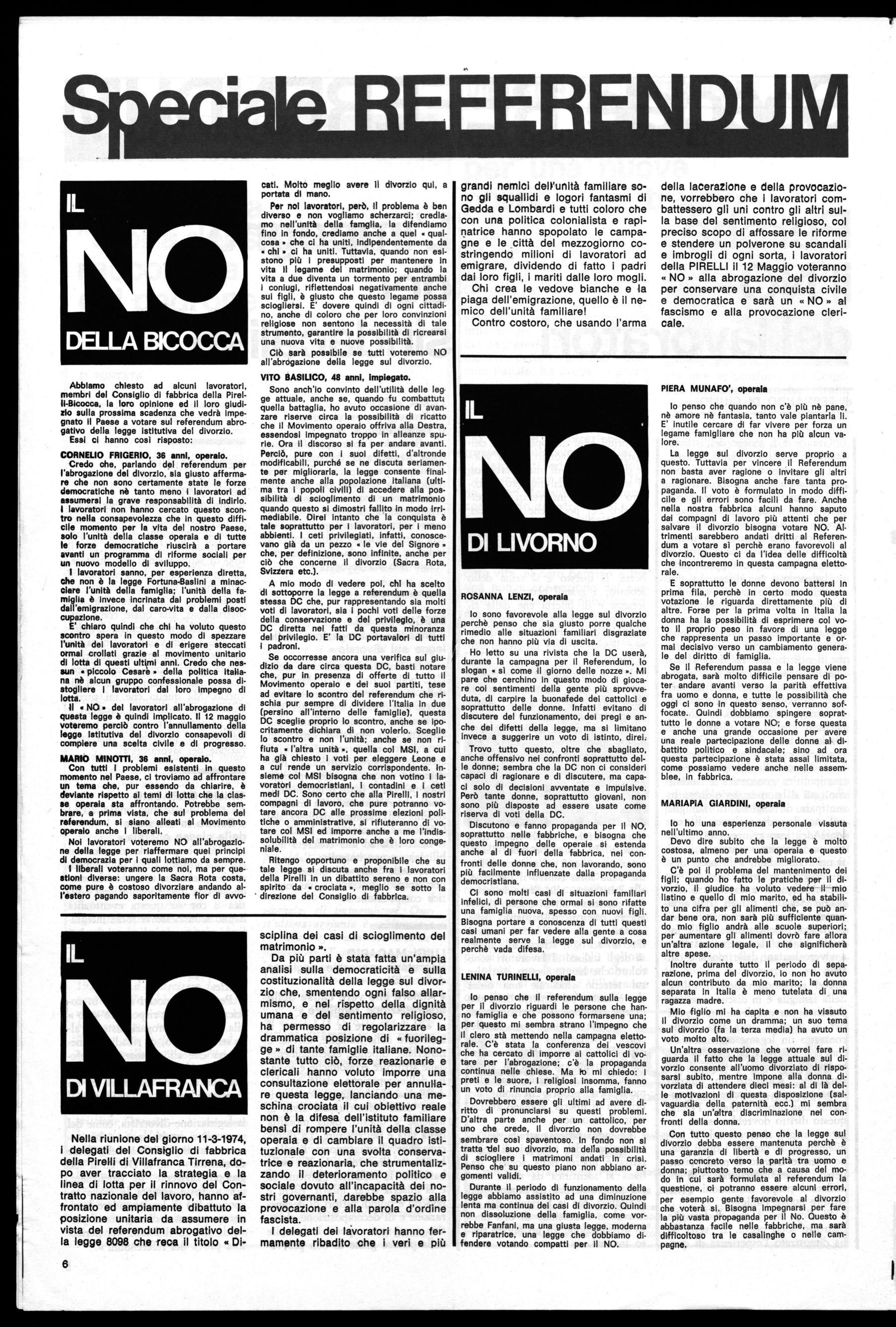 da invece in direzione contraria, non può che incontrare l'opposizione ferma e serrata dei comunisti: questo è fondamentalmente anche il senso del nostro atteggiamento nei confronti del 5° Governo Rumor nato dalle ceneri dell'ultima recente crisi di governo. Non sempre il collegamento tra i temi, solo apparentemente isolati, che stanno al centro di un contratto che ha visto contrapposti lavoratori e padronato, e i temi della più generale battaglia in difesa degli interessi economici o dei più generali diritti civili e di libertà dei cittadini (come nel referendum per il divorzio) è immediatamente presente alla coscienza di tutti i lavoratori. Compito deì comunisti e della loro forza organizzata è ancora una volta quello di far compiere, nel corso della lotta per la realizzazione degli obiettivi conseguiti e nello sforzo di collegare questa con la più generale battaglia di classe e democratica, un balzo in avanti nell'elevamento della coscienza politica di tutti i lavoratori.